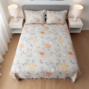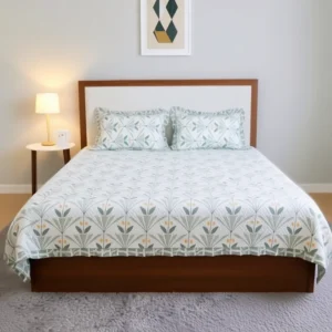 Transform your bedroom into a calm and elegant sanctuary with the FeelsGood Premium Serene Botanical Leaf Quilted Bed Cover Set. This beautiful design features graceful blue leaves and delicate branch patterns, artfully scattered across a crisp white background with subtle chevron Quilting—perfect for those who appreciate understated elegance and nature-inspired tranquility.  Enhanced Features & Comfort Size and Fit: This luxurious Double Bed Size (90 x 100 inches) bedspread is also designed to Fit to King Size Bed Also, offering excellent versatility and comprehensive coverage. Quilted Luxury: Crafted with high-quality Quilting, the bed cover provides a soft, padded, and comfortable feel that is gentle on the skin, ensuring durability for year-round use. Complete Set: The set includes 1 Double Size Quilted Bed Cover and 2 Big Size Pillow Covers with Frill, completing the coordinated and harmonious look. (Note: The original text mentioned a ruffle frill was not needed here, but the required features included it. I’ve added it to the pillow covers for maximum detail.) Premium Finish: The serene botanical pattern and classic blue and white palette create a refreshing and sophisticated ambiance that instantly elevates the look of your bedroom. This bed cover set is ideal for master bedrooms, minimalist décor, guest rooms, nature lovers, or gifting, offering both refined style and comfort in one beautiful package.  Key Specifications Design Name: Serene Botanical Leaf Bed Cover Size: Double Bed Size 90 x 100 inches Quilting: Quilted Comfort Fabric (Soft, padded, and durable material.) Compatibility: Fit to King Size Bed Also Pillow Covers: Includes 2 Big Size Pillow Covers with Frill Palette: Elegant Blue & White (Classic combination for a bright, calm, and sophisticated look.)  Washing Tips (Care Instructions) Gentle Cycle: Machine wash in cold water on a gentle cycle. Color Safety: Always use a color-safe detergent to protect the prints and colors. Avoid Bleach: Do not use harsh bleach or chemicals. Tumble Dry Low / Air Dry: For best results, air dry on a line in the shade. If using a dryer, use the low heat/tumble dry low setting. Ironing: Iron on a low temperature setting if necessary.