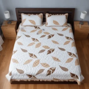 Transform your bedroom into a cozy, natural retreat with the FeelsGood Premium Autumn Leaf Quilted Bed Cover. This charming design features large, stylized leaves in a rich palette of deep brown, tan, and cream, set against a light background with delicate hexagonal Quilting—perfect for those who appreciate earthy tones, nature-inspired serenity, and subtle patterns.  Enhanced Features & Comfort Size and Fit: This luxurious Double Bed Size (90 x 100 inches) bedspread is also designed to Fit to King Size Bed Also, offering excellent versatility and comprehensive coverage. Quilted Luxury: Crafted with high-quality Quilting, the bed cover provides a soft, padded, and comfortable feel that is gentle on the skin, ensuring durability for year-round use. Complete Set: The set includes 1 Double Size Quilted Bed Cover and 2 Big Size Pillow Covers with Frill, completing the coordinated and harmonious look. Premium Finish: The elegant leaf pattern and warm, natural colors bring a subtle charm. A lovely Elegant Ruffle Frill in a coordinating geometric pattern adds a premium touch and beautifully conceals the sides of your bed. This bed cover set is ideal for master bedrooms, themed rooms, guest rooms, home décor enthusiasts, or gifting, offering both natural elegance and comfort in one beautiful package.  Key Specifications Design Name: Earthy Autumn Leaf Bed Cover Size: Double Bed Size 90 x 100 inches Quilting: Quilted Comfort Fabric (Soft, padded, and durable material.) Compatibility: Fit to King Size Bed Also Pillow Covers: Includes 2 Big Size Pillow Covers with Frill Palette: Earthy Brown & Cream (Warm, natural colors for a cozy, sophisticated, and calming look.) Features: Elegant Ruffle Frill  Washing Tips (Care Instructions) Gentle Cycle: Machine wash in cold water on a gentle cycle. Color Safety: Always use a color-safe detergent to protect the prints and colors. Avoid Bleach: Do not use harsh bleach or chemicals. Avoid Direct Sunlight: To maintain its beauty and prevent fading, dry away from direct sunlight. Tumble dry on low heat if needed. Low Heat Iron: Iron on a low temperature setting if necessary.