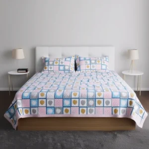 Bring a playful, modern, and comforting ambiance into your bedroom with the FeelsGood Premium Sweet Dreams Geometric Heart Quilted Bed Cover Set. This charming design features delightful heart shapes arranged in an organized checkerboard pattern, woven into a beautiful combination of light and soothing colors—Soft Pink, Sky Blue, Grey, and hints of Gold. With subtle Quilting, this FeelsGood set is perfect for creating a light, cheerful, and inviting space.  Enhanced Features & Comfort Size and Fit: This luxurious Double Bed Size (90 x 100 inches) bedspread is also designed to Fit to King Size Bed Also, offering excellent versatility and comprehensive coverage. Quilted Luxury: Crafted with high-quality Quilted Cotton Comfort Fabric, it provides a soft, padded, and comfortable feel that is gentle on the skin, ensuring durability for year-round use. Complete Set: The set includes 1 Double Size Quilted Bed Cover and 2 Big Size Pillow Covers with Frill, completing the cohesive and welcoming aesthetic. Premium Finish: The fresh and cheerful palette and modern heart pattern offer a pleasant, inviting vibe that instantly elevates the look of your bedroom. This bed cover set is ideal for master bedrooms, kids’ rooms, guest rooms, modern/playful decor, or as a thoughtful gift, offering both refined style and comfort in one beautiful package, guaranteed by FeelsGood.  Key Specifications Design Name: Sweet Hearts Grid Bed Cover Size: Double Bed Size 90 x 100 inches Quilting: Quilted Cotton Comfort Fabric (Soft, padded, and durable material.) Compatibility: Fit to King Size Bed Also Pillow Covers: Includes 2 Big Size Pillow Covers with Frill Color Palette: Soft Pink, Sky Blue, Grey, and Gold for a charming, cheerful, and modern look.  Washing Tips (Care Instructions) Gentle Cycle: Machine wash in cold water on a gentle cycle. Color Safety: Always use a color-safe, mild detergent to protect the prints and colors. Avoid Bleach: Do not use harsh bleach or chemicals. Avoid Direct Sunlight: To maintain its beauty and prevent fading, dry away from direct sunlight. Low Heat Iron: Iron on a low temperature setting if necessary.