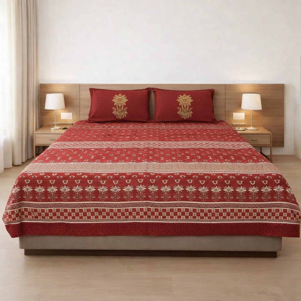 Enhance your bedroom with the timeless elegance of the Feels Good Premium King Size Ethnic Printed Bedsheet. Designed with a rich red base color and traditional floral motifs, this bedsheet brings a classic and luxurious touch to your bedroom décor.