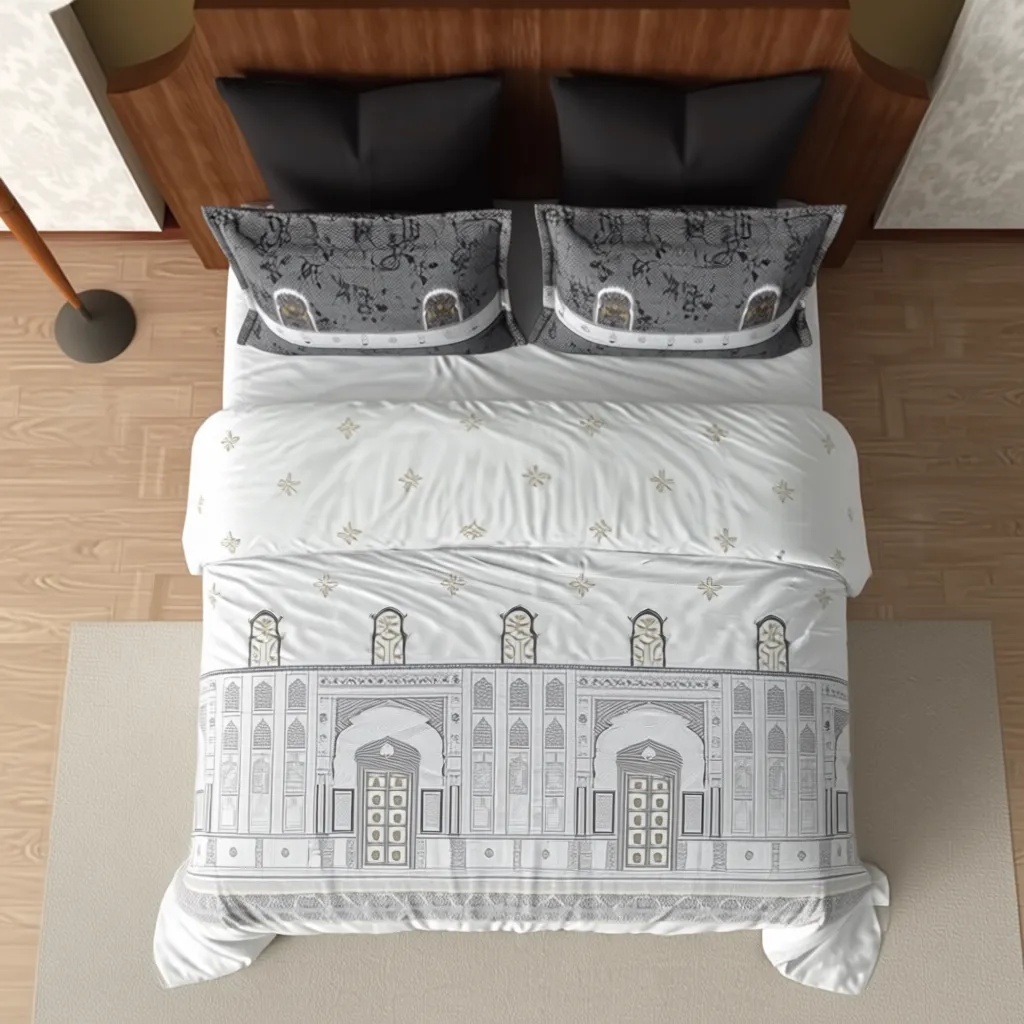 The bedsheet features a pristine White and Light Grey base illustrating grand architectural lines, while the Dark Grey pillow covers add a bold contrast. The subtle hints of Mustard Gold/Yellow in the floral motifs add just the right amount of color to break the monochrome look. It is perfect for those who appreciate art, history, and understated luxury.
