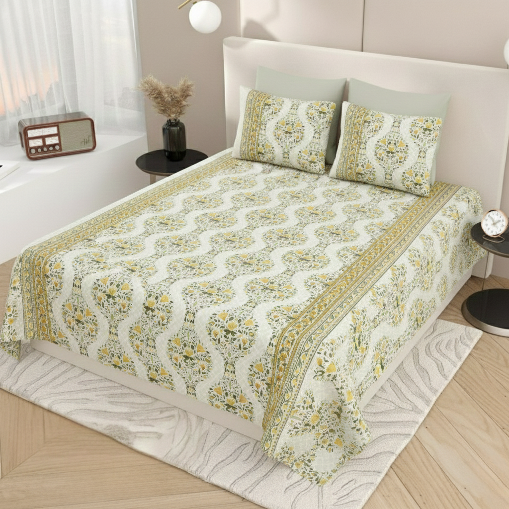 FeelsGood Home Decor 100% Pure Cotton Double Bed Bedsheet (90×100) | Refreshing Yellow Floral Wave Print | Super Soft & Breathable | With 2 Pillow Covers