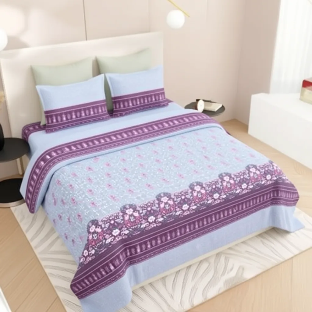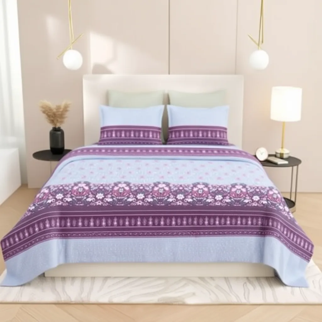 The highlight of this bedsheet is its stunning color palette. The soothing Sky Blue background is adorned with small floral buttas, while the edges feature a wide, magnificent Deep Purple (Wine) Border. This border is detailed with traditional floral vines and geometric elements, inspired by royal Indian palaces.