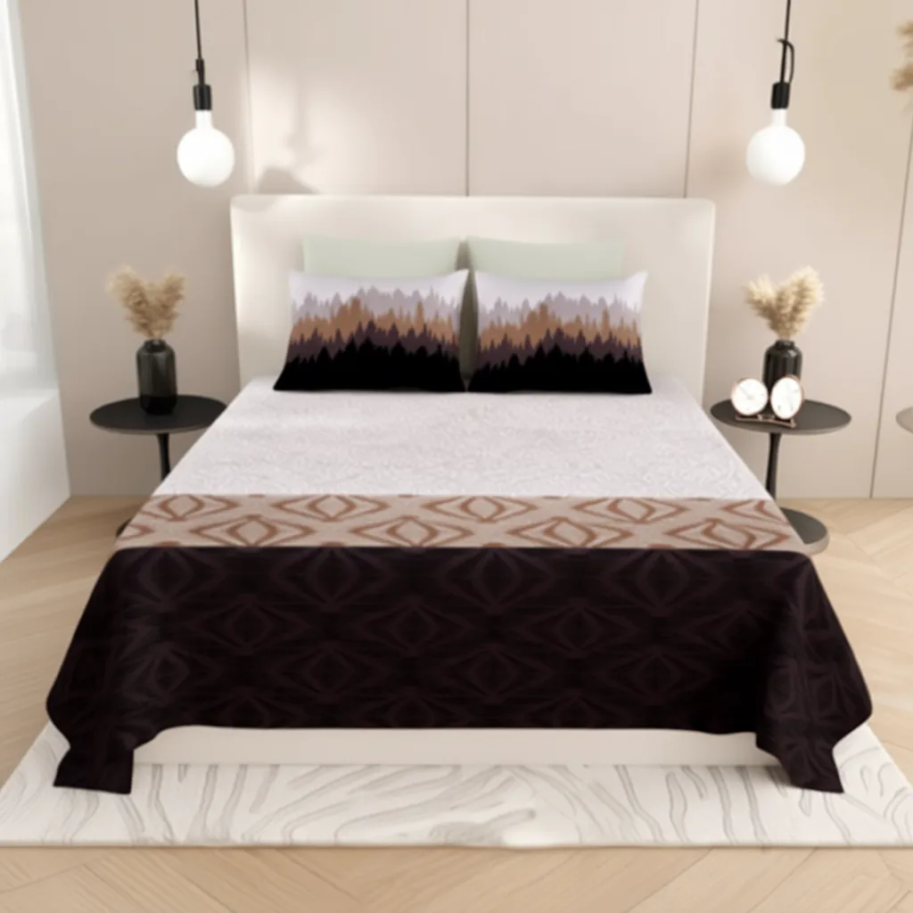 • Nature-Inspired Design: A beautiful fusion of geometric patterns on the sheet and a serene forest landscape on the pillow covers in warm brown shades.
