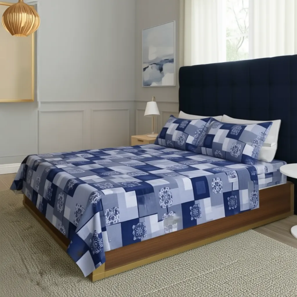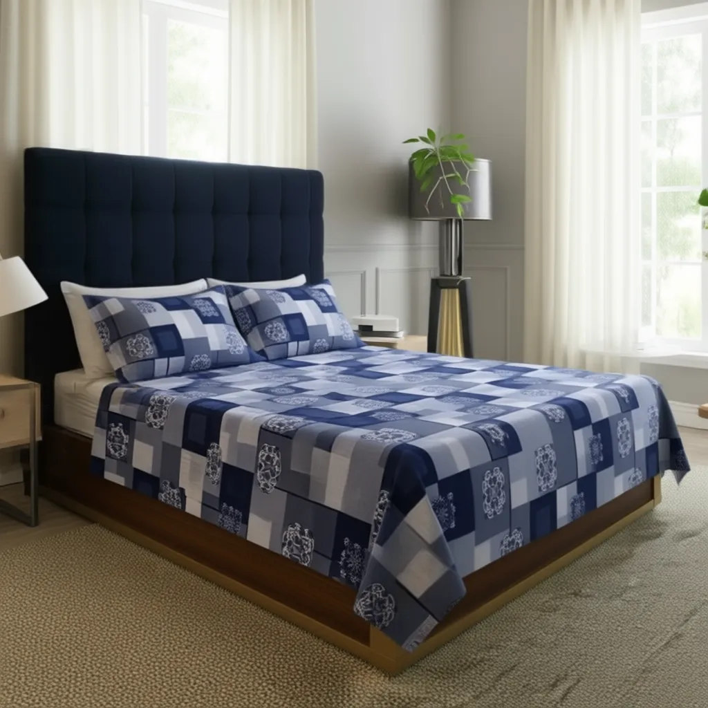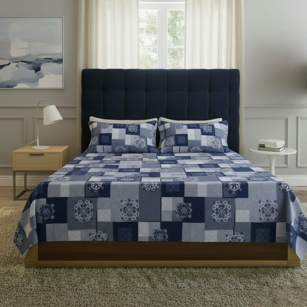 Upgrade your bedroom décor with the FeelsGood Home Decor 100% Pure Cotton Single Bed Bedsheet in Blue & Grey Printed Design. Crafted from premium quality pure cotton, this single bed bedsheet (150 cm x 220 cm) is soft, breathable, and durable—perfect for daily use. The stylish blue and grey checkered pattern with artistic motifs brings a modern and elegant charm to your bedroom décor.