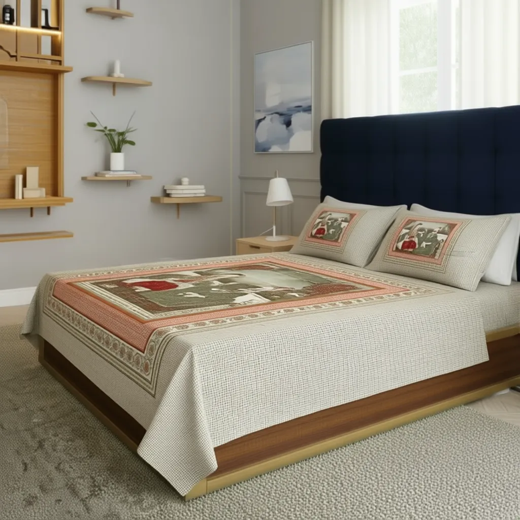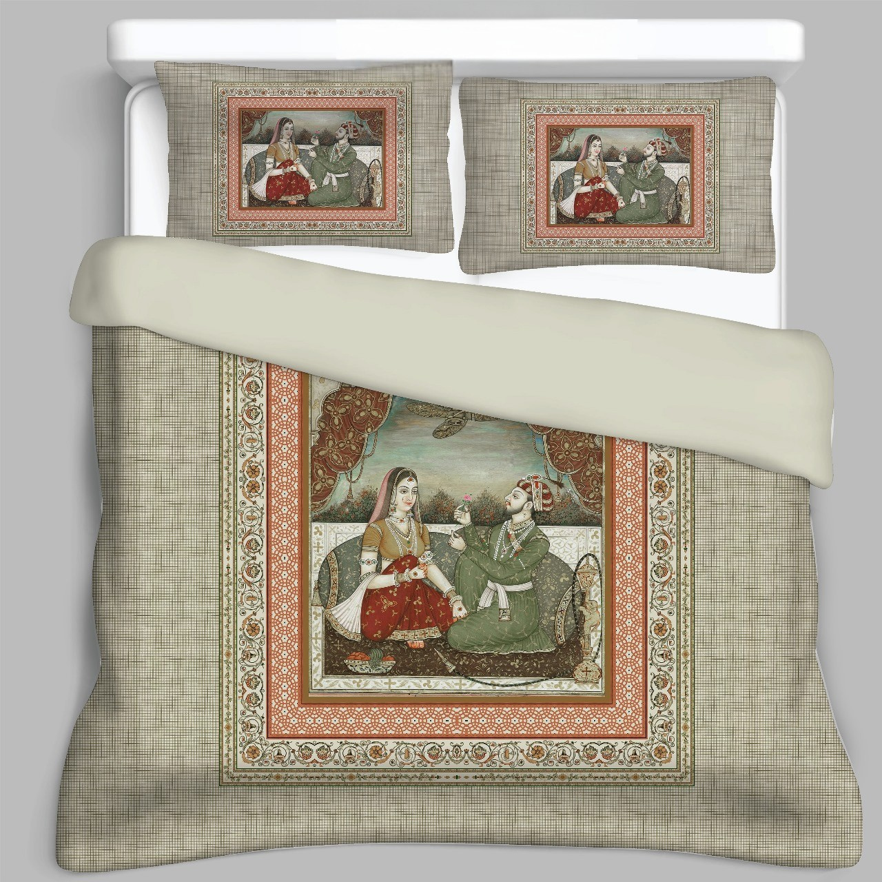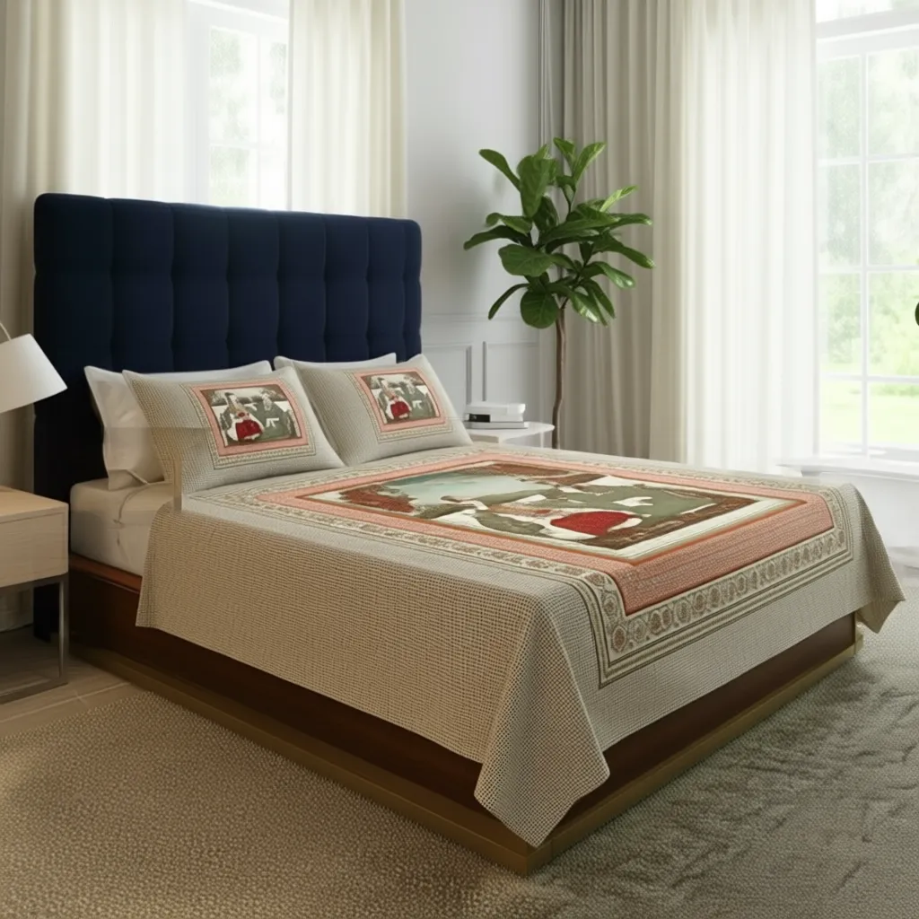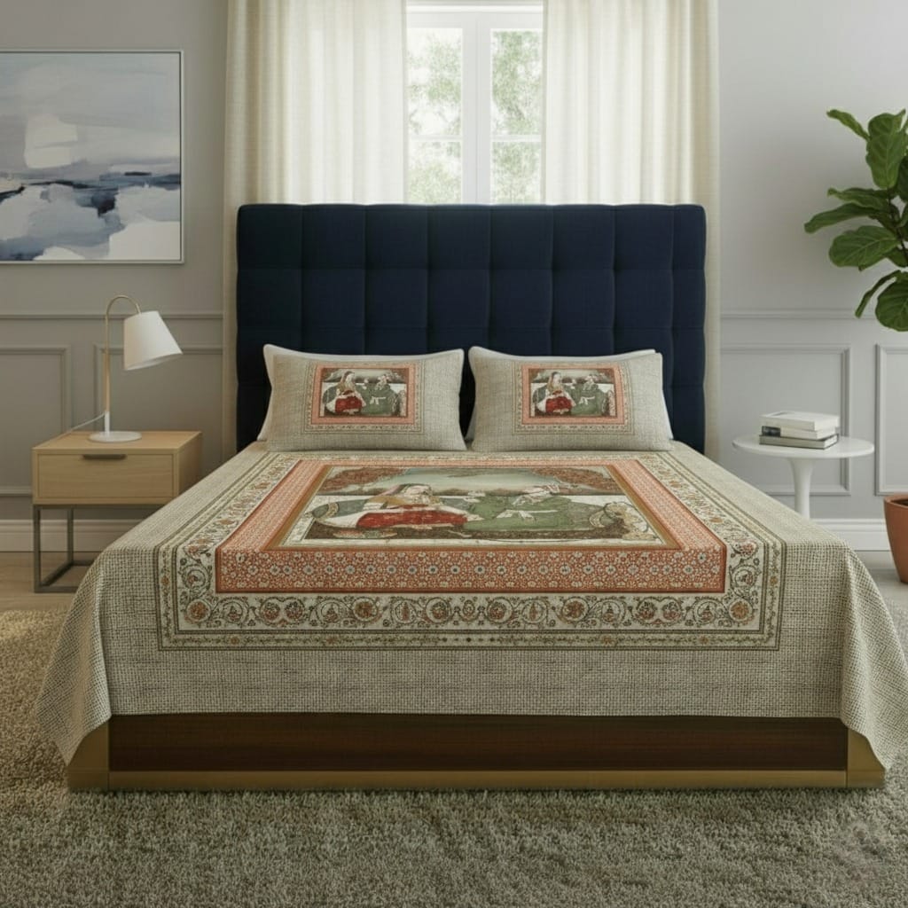 Bring a touch of timeless elegance and royalty to your bedroom with this exquisite bedsheet set from FeelsGood Home Decor. Crafted from 100% Organic Pure Cotton, it offers exceptional softness and breathability. The high-quality digital print features a classic Mughal miniature art scene of a royal couple, beautifully rendered with intricate details. The beige and terracotta color palette, along with a subtle checkered pattern, creates a sophisticated and artistic look.