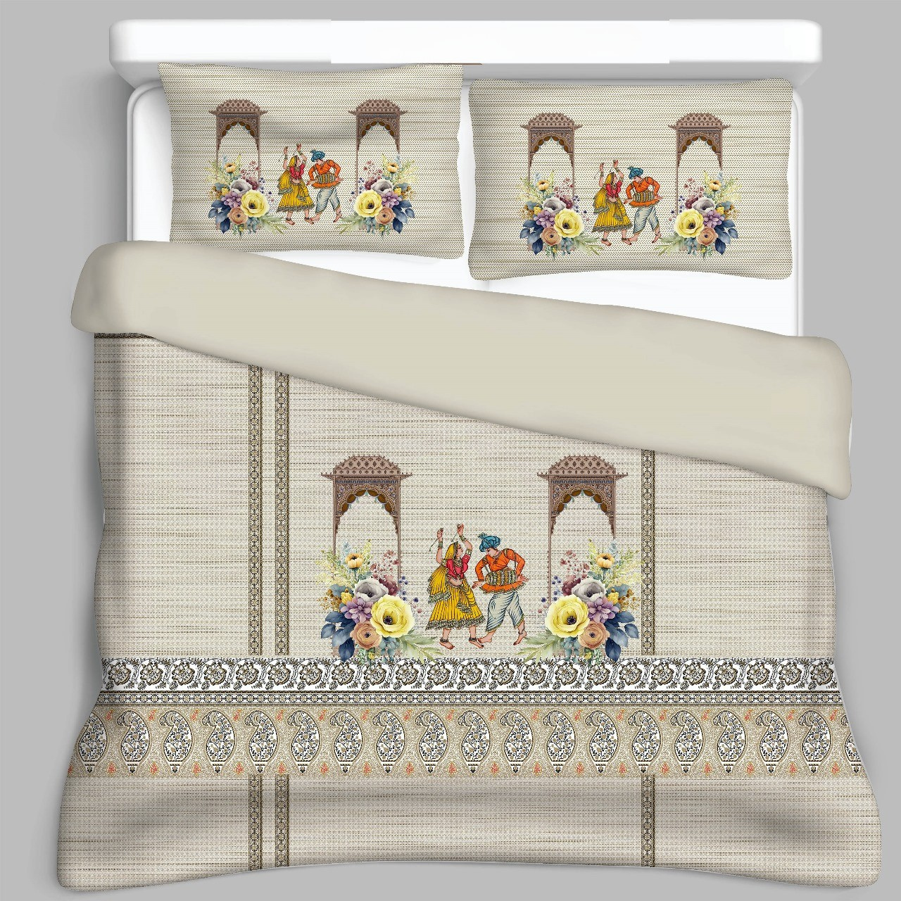 Ā Infuse your bedroom with cultural vibrancy and artistic charm with this exquisite bedsheet set from FeelsGood Home Decor. Made from 100% Organic Pure Cotton, it offers a wonderfully soft and breathable feel for a comfortable night’s rest. The captivating digital print showcases lively folk dancers, framed by traditional architectural arches and vibrant floral arrangements, all set against a subtle, textured beige background. A beautiful paisley border adds an elegant touch to the design.