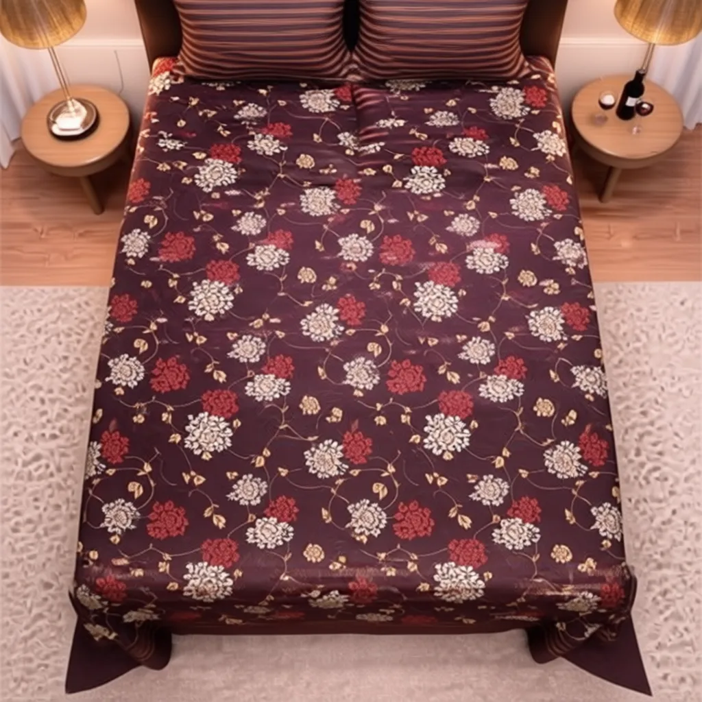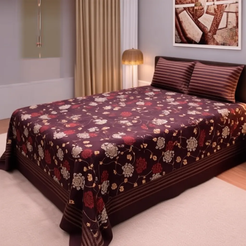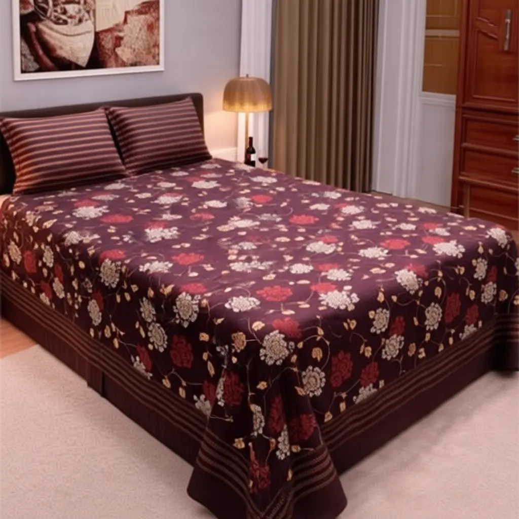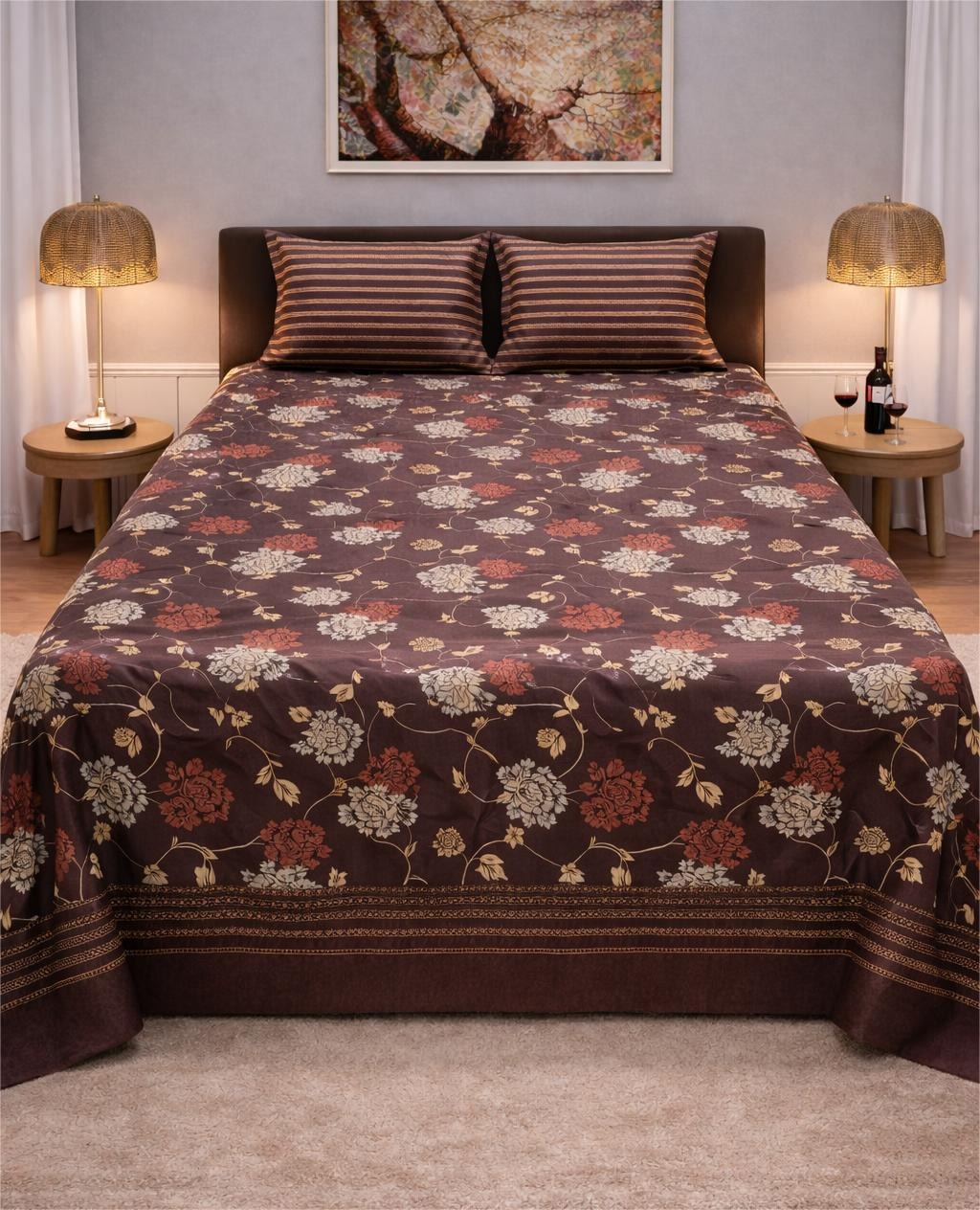 Bring the warmth of nature into your home with our Coffee Brown Botanical Floral bedsheet. This set features a sophisticated deep coffee-colored base adorned with a scattered garden of blooming flowers in earthy rust, cream, and soft beige tones. The delicate vine-like patterns create a sense of movement and freshness, making it the perfect choice for a master bedroom that seeks a cozy, organic, and peaceful vibe. The elegant floral body is perfectly framed by a sleek, striped border that adds a modern touch to the traditional botanical print.