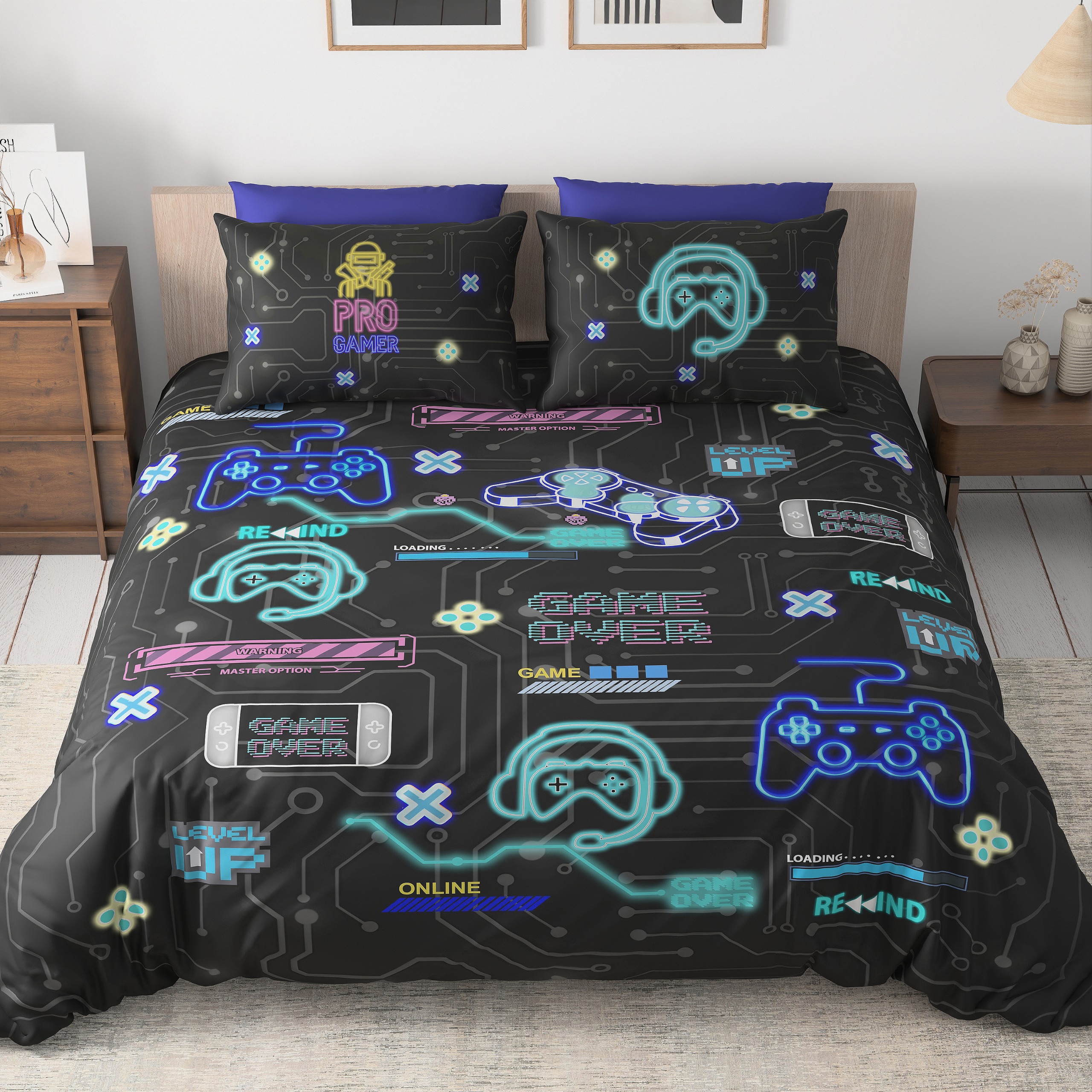 Level up your bedroom decor with the FeelsGood Home Decor Gamer Bedsheet Set! This bedsheet is a must-have for any gaming enthusiast, featuring a cool, futuristic digital print with glowing gaming controllers, headsets, and various gaming-related phrases like “LEVEL UP,” “PRO GAMER,” and “GAME OVER.” It’s the perfect way to bring your love for gaming into a cozy space.