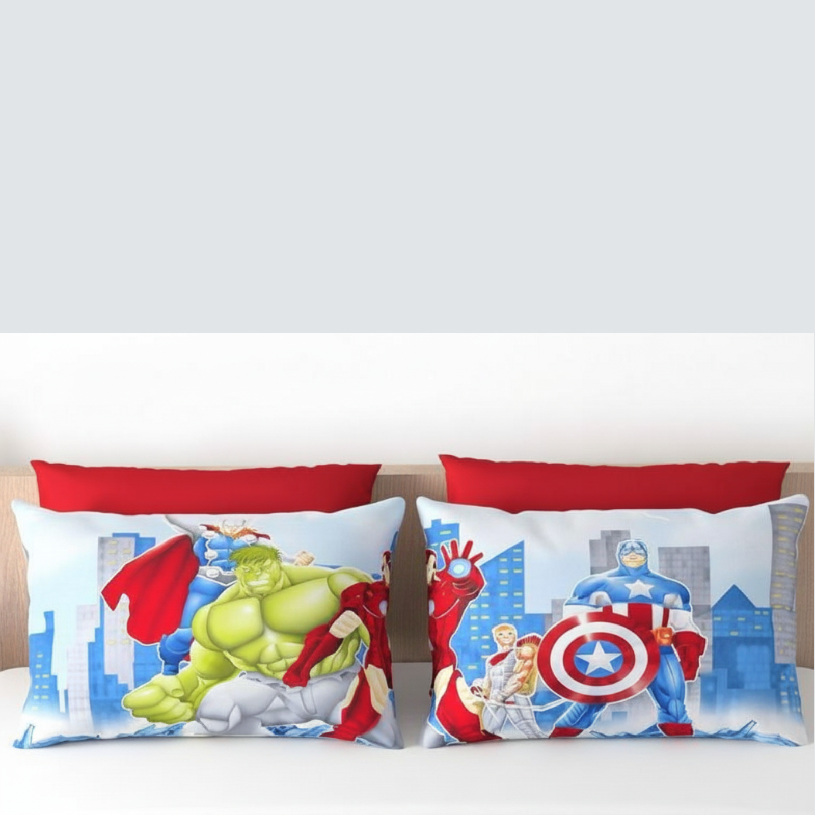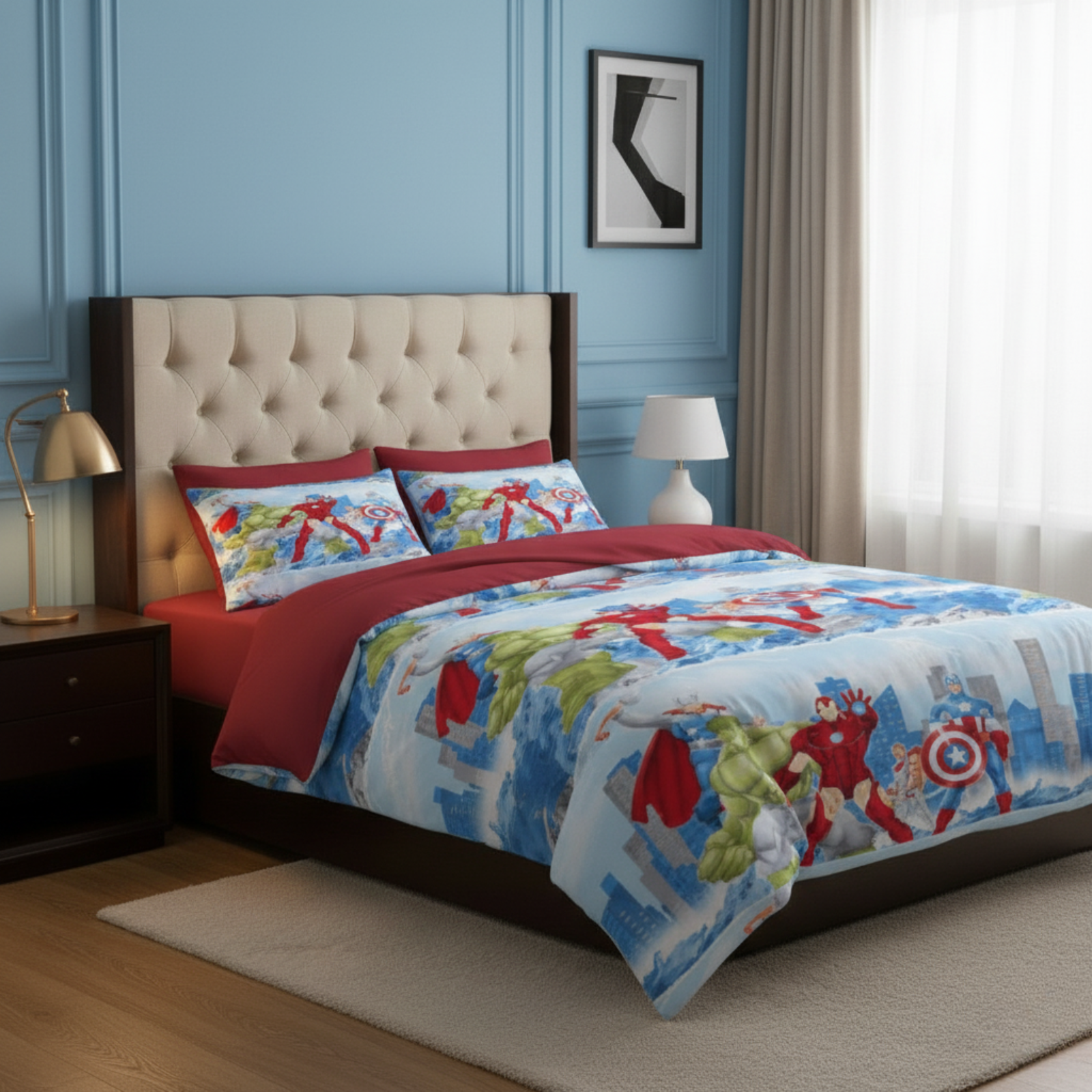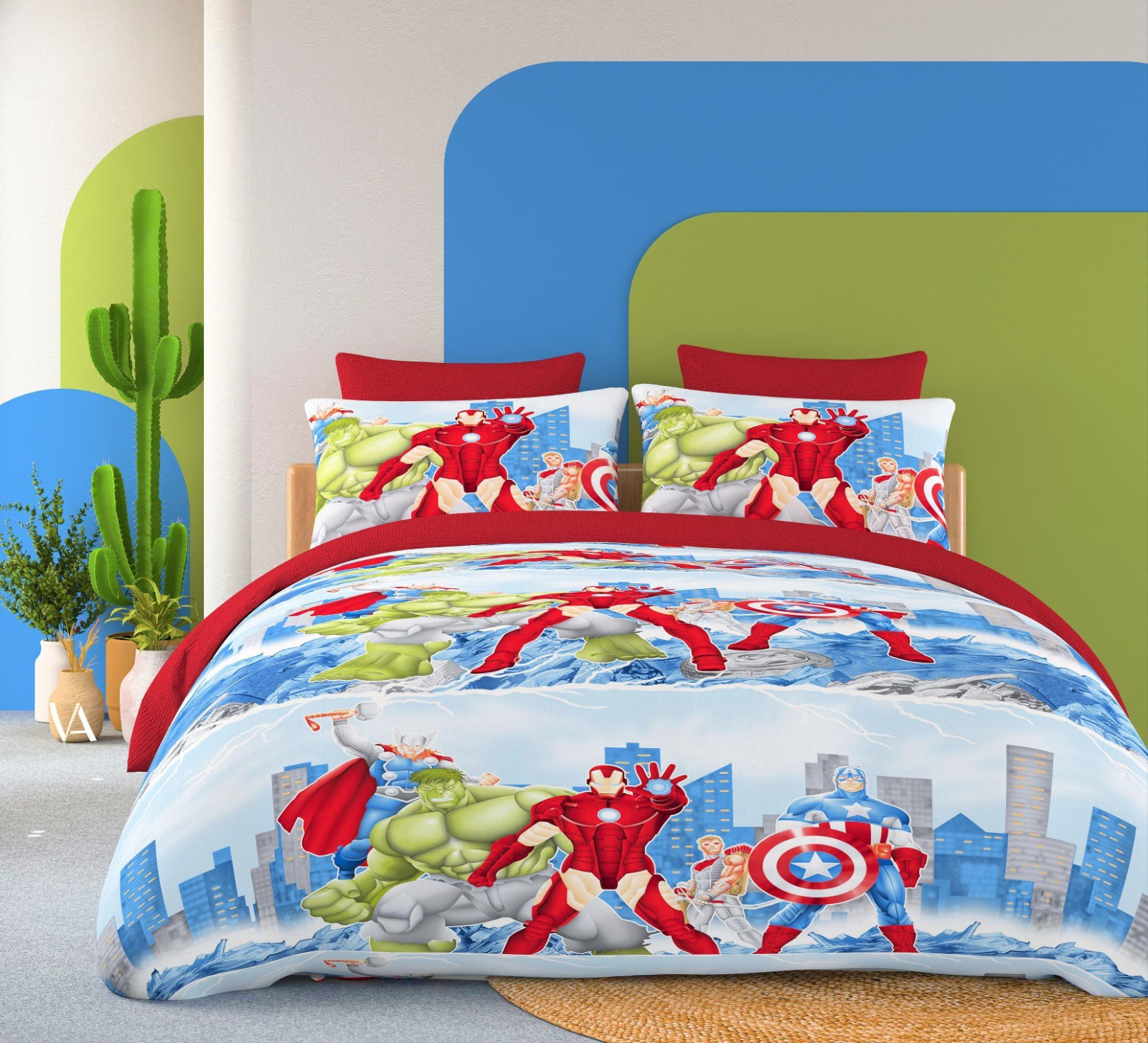 Unleash the Power of the Avengers at Bedtime with the FeelsGood Home Decor Kids Organic Pure Cotton Double Bedsheet Set! This action-packed bedsheet features the iconic Marvel team—Hulk, Iron Man, Captain America, and Thor—standing ready against a dynamic city background with lightning effects. The bold and vibrant colors bring the thrilling world of superheroes to life, inspiring heroic dreams and exciting adventures.