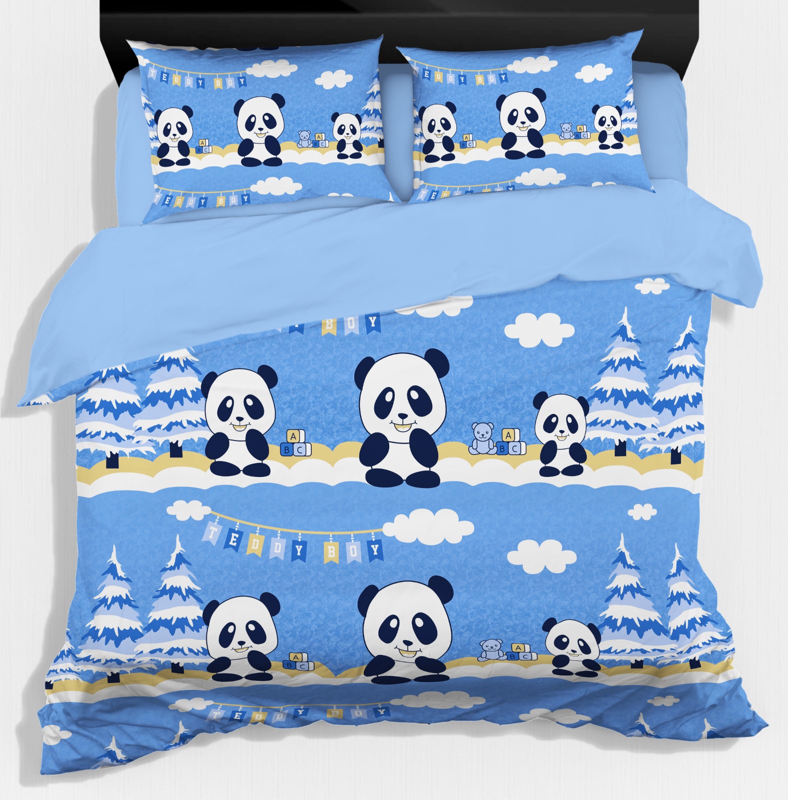 Create a cozy and playful bedroom with the FeelsGood Home Decor Kids Organic Pure Cotton Double Bedsheet Set. This adorable bedsheet features a charming print of cute panda bears playing in a snowy, whimsical landscape with teddy bears and ABC blocks. The calming blue background and cheerful design make it the perfect addition to any child’s room, creating a soothing and fun space for sweet dreams.