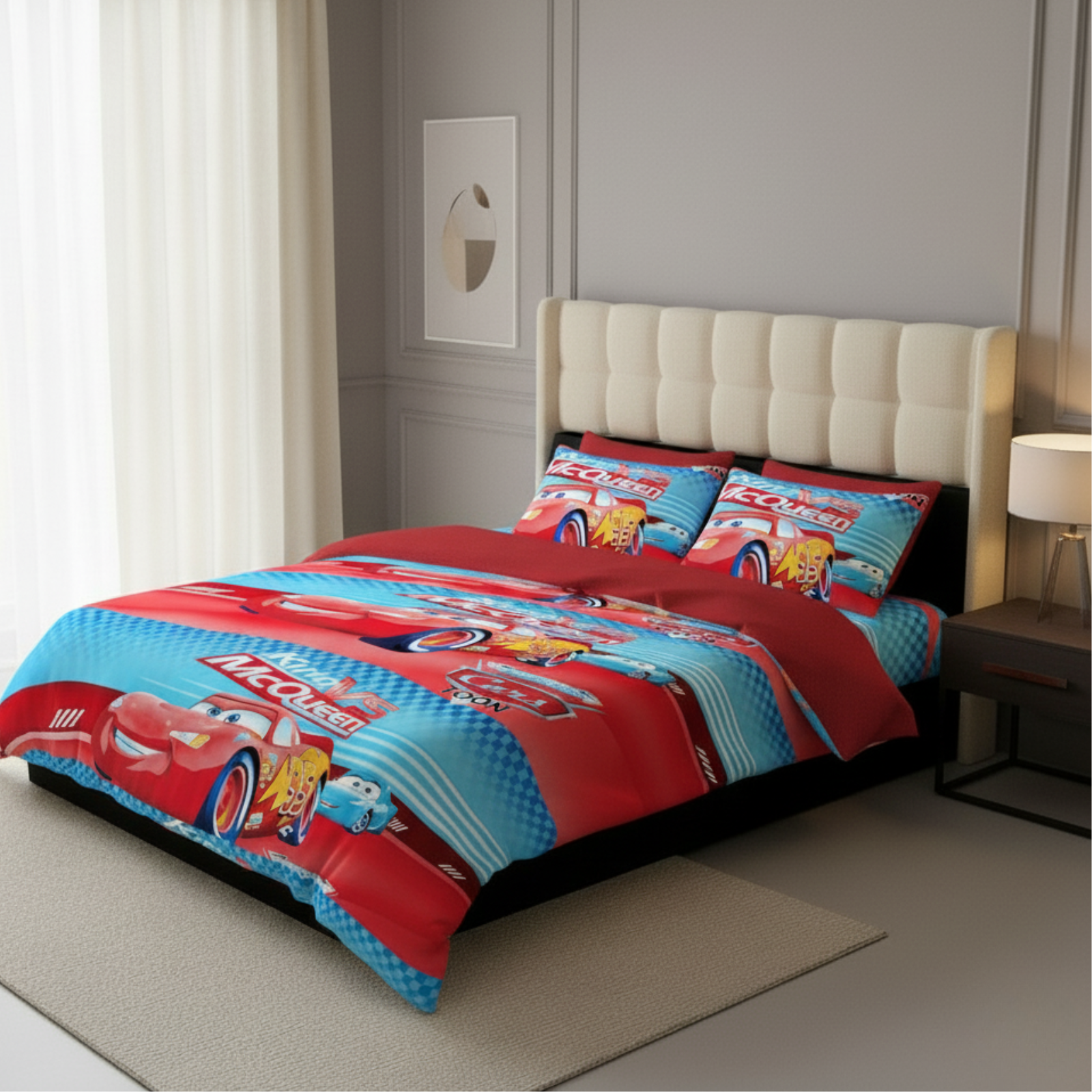 Get ready to race into bedtime adventures with the FeelsGood Home Decor Kids Organic Pure Cotton Double Bedsheet Set! This action-packed bedsheet features everyone’s favorite race car, Lightning McQueen, along with his friends on a fun, race-themed background. The vibrant design is filled with classic racing elements like the number 95 and checkered flags, making bedtime an exciting adventure for any Cars movie fan.