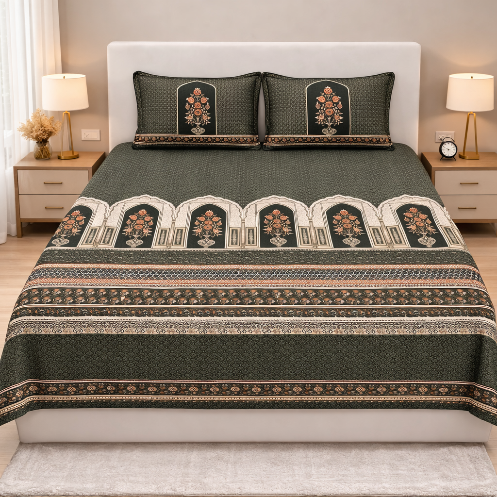 Enhance your bedroom with the royal elegance of the FeelsGood Home Decor King Size Bedsheet. This beautifully designed bedsheet features a rich dark green base with intricate cream arch patterns and elegant floral motifs in warm rust tones, giving your bed a luxurious and sophisticated look.