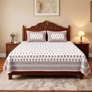 The heritage-inspired royal arch pattern creates a stunning visual centerpiece on your bed, while the detailed decorative borders enhance its premium look. The set also includes matching pillow covers with coordinated floral motifs, perfectly completing the elegant bedding style.