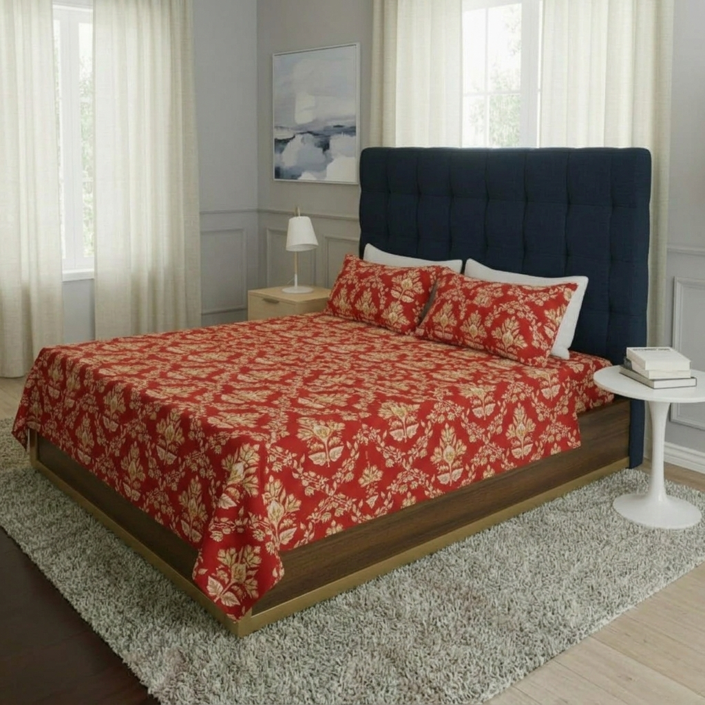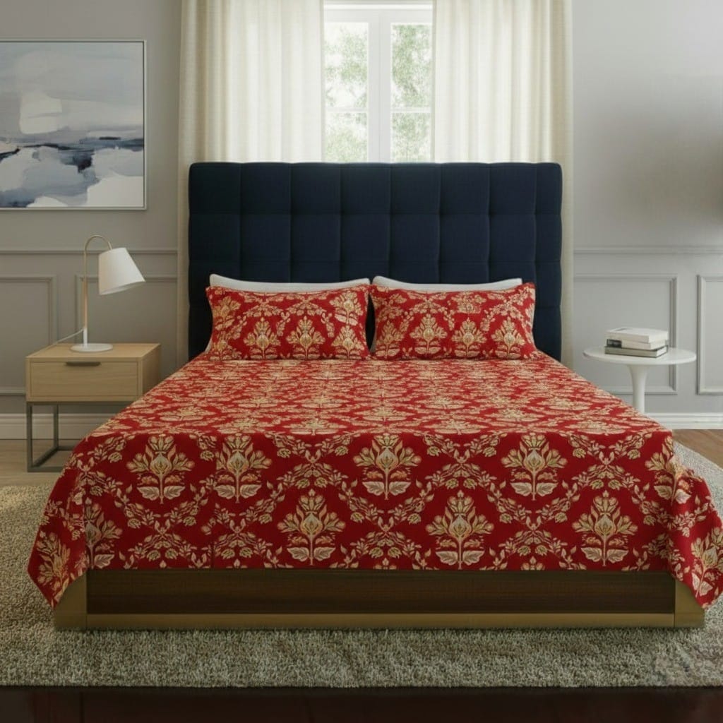 Add a royal touch to your bedroom with the FeelsGood Home Decor Double Bed Bedsheet, crafted from premium microfiber fabric for a soft, smooth, and luxurious feel. The elegant Red & Beige Royal Floral Print Design makes this bedsheet a perfect blend of tradition and style, enhancing the beauty of any modern or classic bedroom décor.