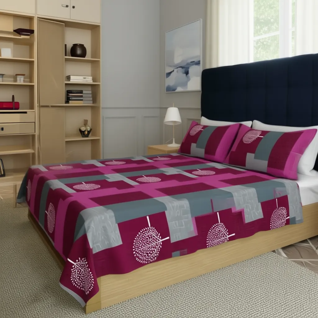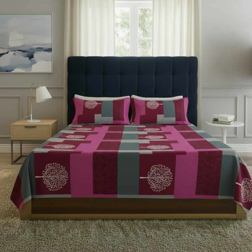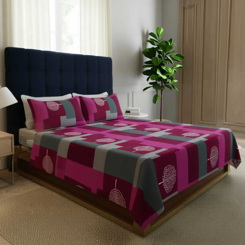 The modern geometric block pattern in rich maroon, grey, and pink shades, combined with subtle tree motifs, creates a stylish and contemporary vibe for your home décor. Specially designed for single beds, this bedsheet adds both charm and practicality to your living space.