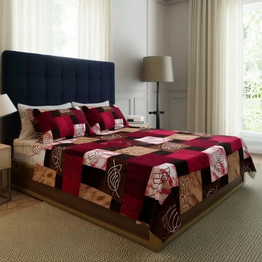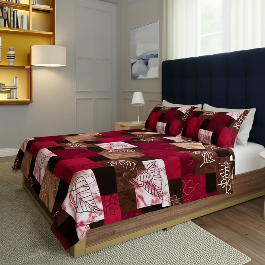 The unique patchwork style in red, brown, and beige shades with elegant leaf motifs adds a modern and refreshing vibe to your room décor. Specially designed for a single bed, this bedsheet combines both functionality and style for your home.