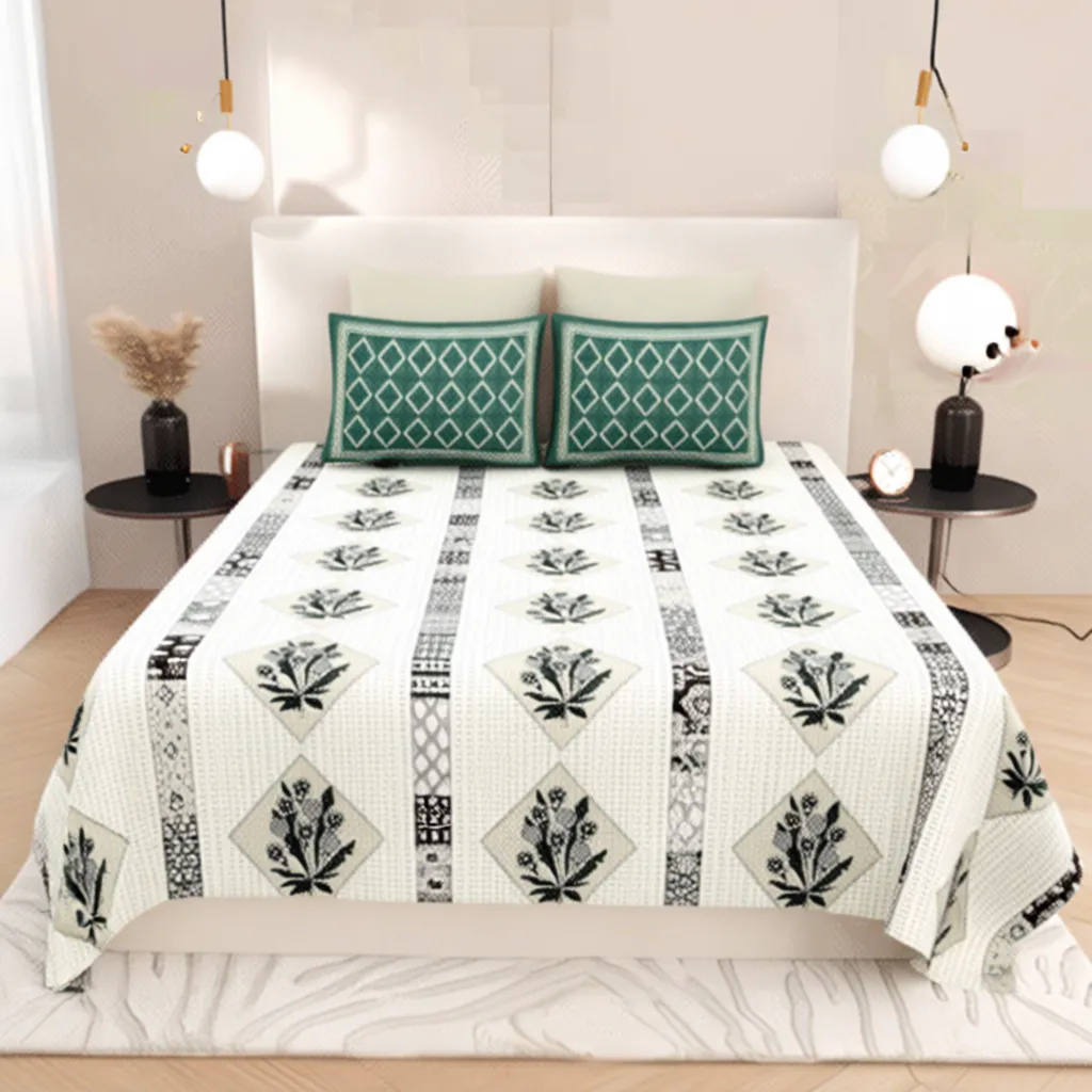 FeelsGood Home Decor Organic Cotton King Size Bedsheet | Elegant Mughal Floral & Diamond Pattern | Neutral Tones