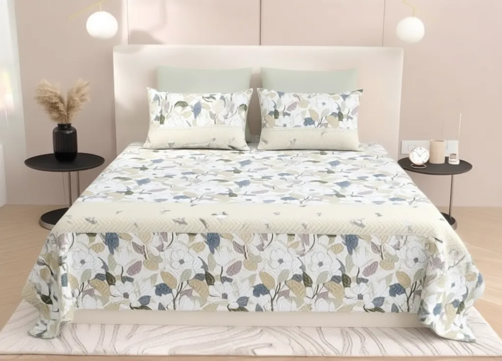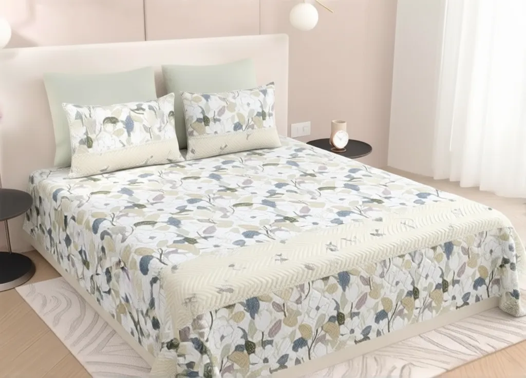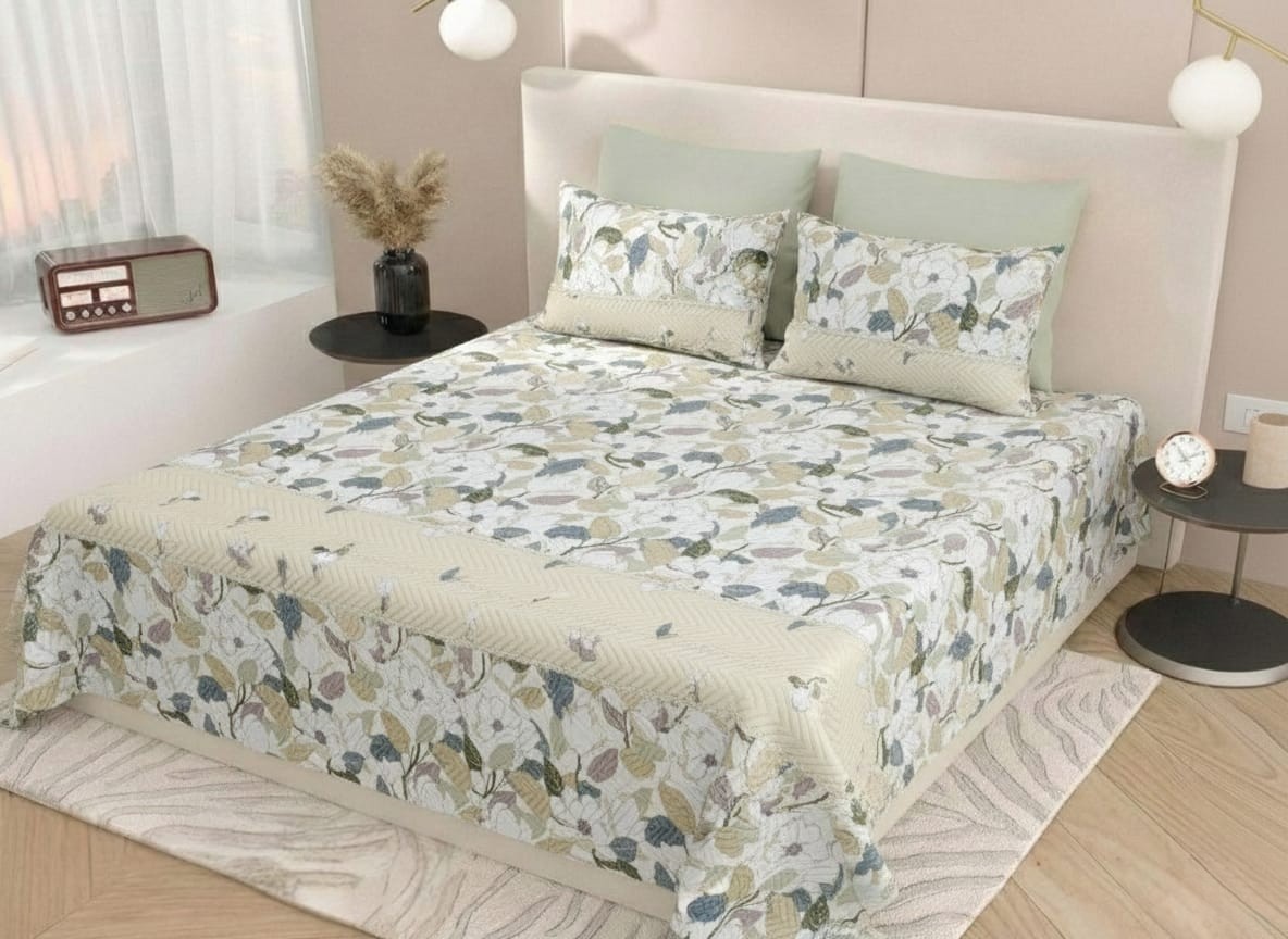 FeelsGood Home Decor Premium Double Bed Bedcover | Elegant Sage Green Floral Print | Soft Cotton Feel Bedspread with 2 Matching Pillow Covers