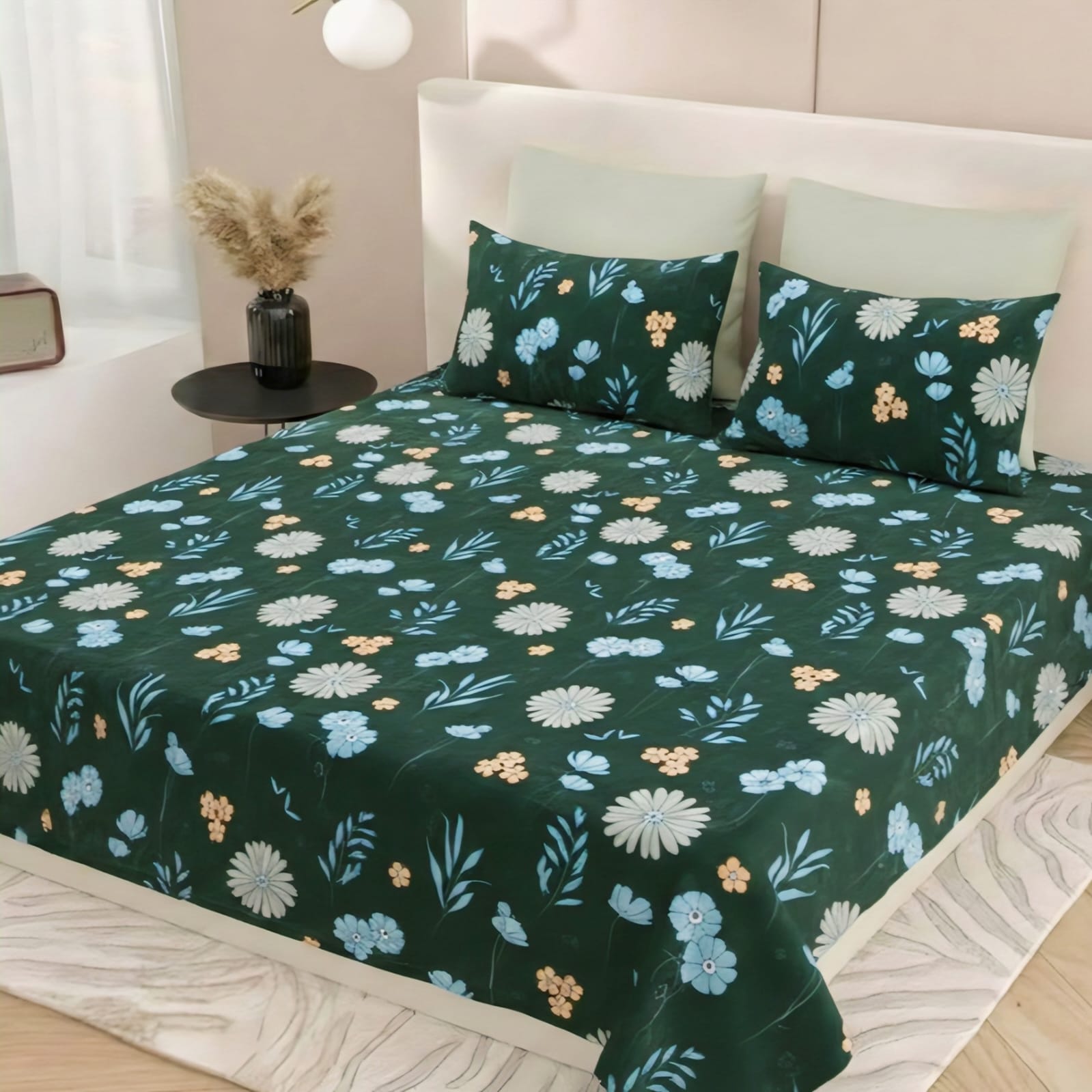Add a touch of warmth and botanical beauty to your bedroom with the FeelsGood Home Decor Premium Winter Double Bedsheet. This bedsheet features a rich dark forest green base with delicate daisy floral patterns in soft blue and peach tones, creating a serene and cozy atmosphere for the coldest nights. This is a traditional non-fitted flat sheet, offering versatile styling and a premium finish for your winter bedding.1