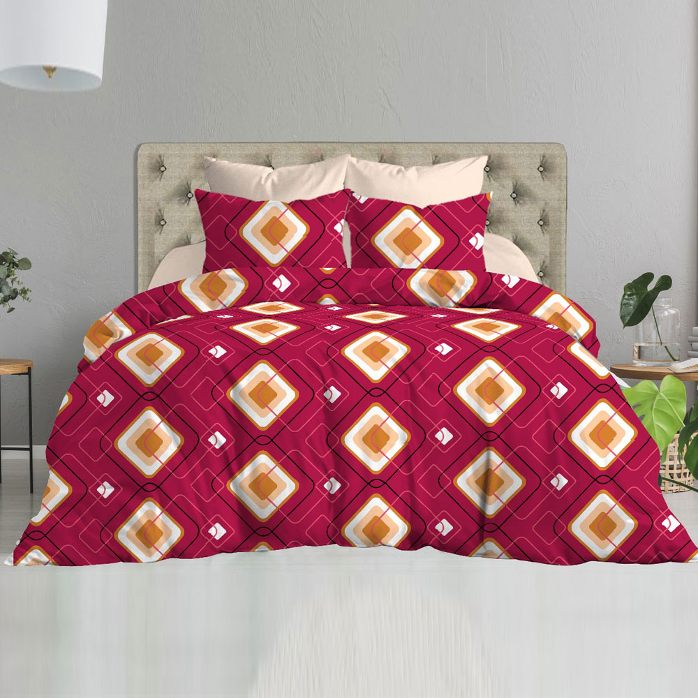 FeelsGood Home Decor Procion Cotton King Size Bedsheet | Bold Abstract Pattern in Maroon & Orange | 3 Pillow Covers