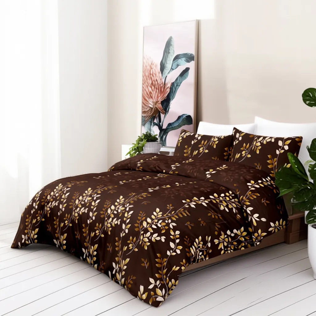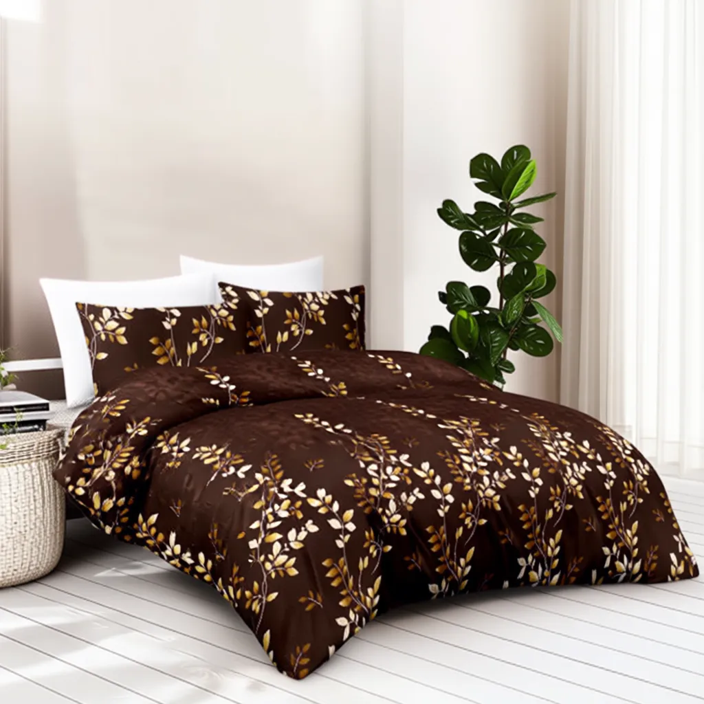FeelsGood Home Decor Procion Cotton King Size Bedsheet | Luxurious Brown with Autumn Leaves Design | 3 Pillow Covers