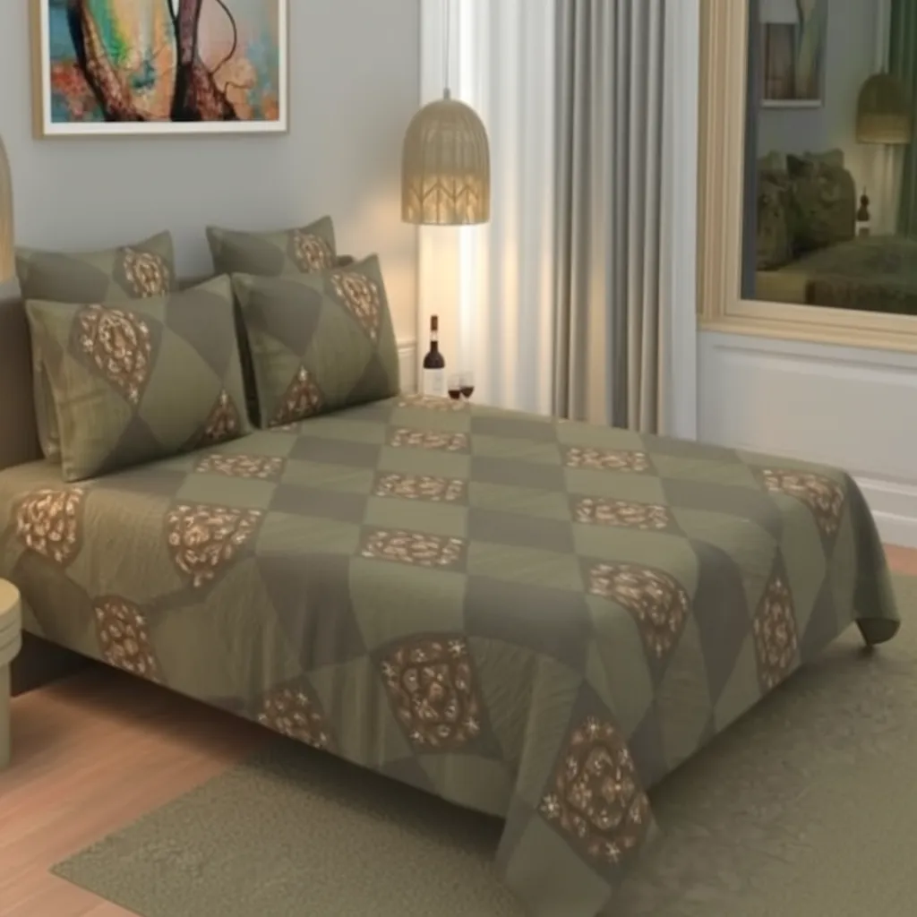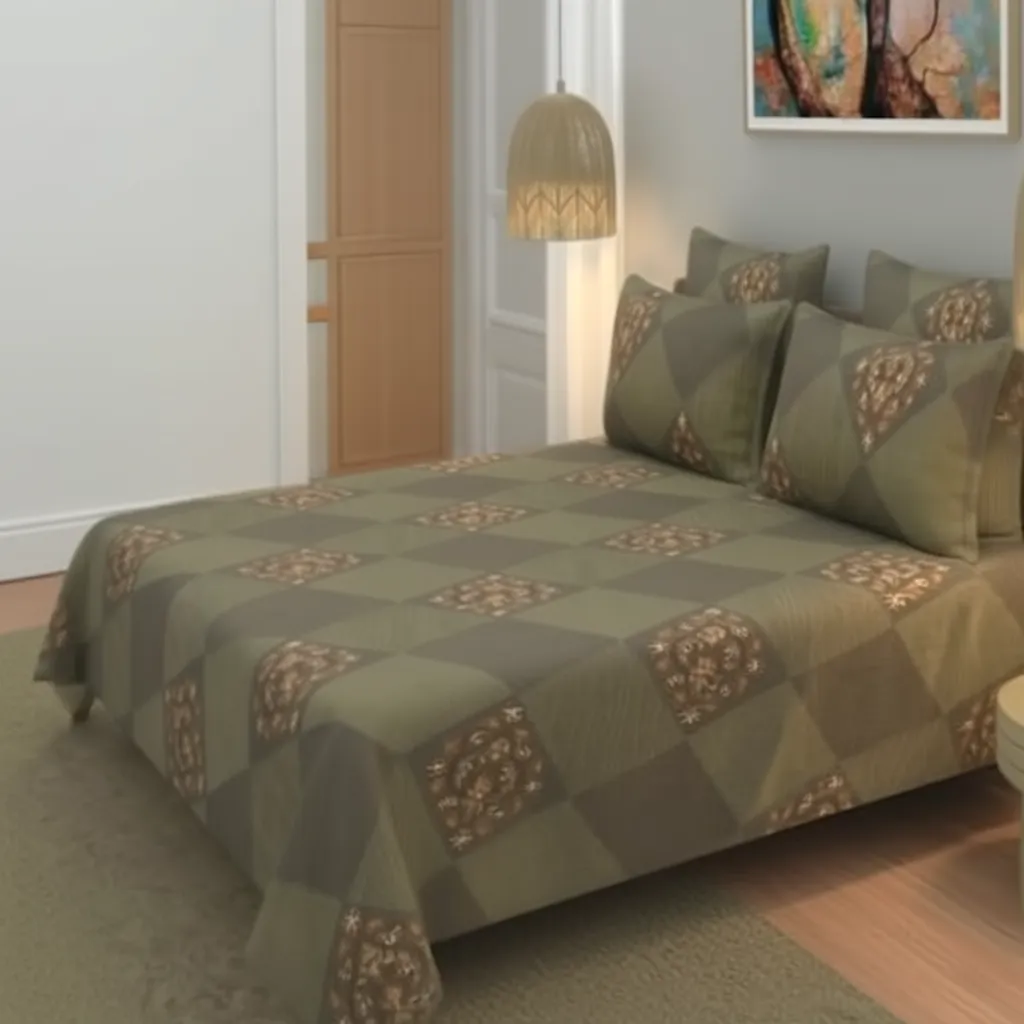 Give your bedroom a bold yet soothing makeover with our Geometric Diamond Checkered bedsheet. This modern design features a sophisticated patchwork-style pattern in earthy olive and sage green tones, accented with intricate ethnic motifs inside the diamonds. Designed for King Size beds, it offers a clean, structured look that fits perfectly in any contemporary home.