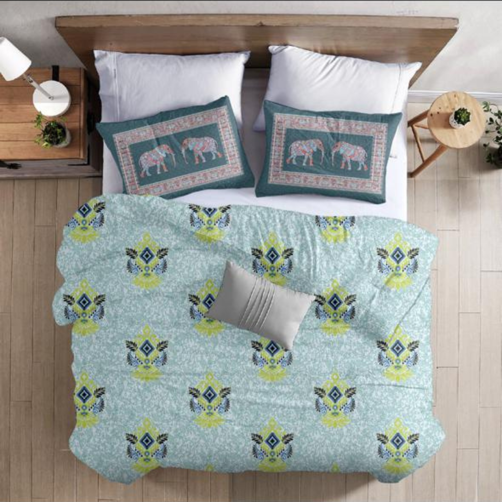 Brighten up your bedroom with the FeelsGood Premium Organic Cotton Double Bedsheet Set, beautifully crafted in an Aqua Blue base with intricate Yellow and Navy traditional motifs. The matching pillow covers featuring royal elephant prints add a unique, heritage-inspired touch to your space.