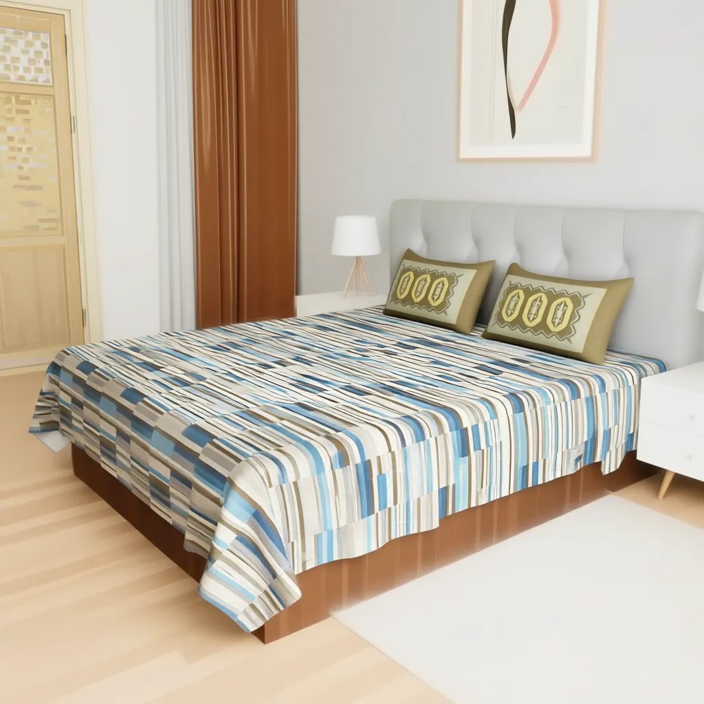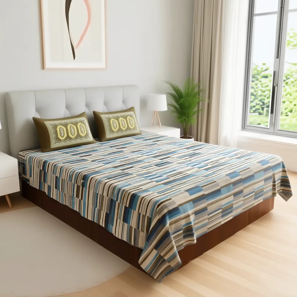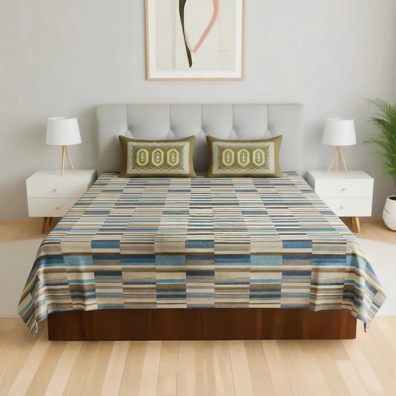 FeelsGood Premium 100% Organic Cotton Double Bedsheet (230cm x 240cm) with 2 Pillow Covers | Soft Procion Quality Fabric | Beige, Blue & Olive Striped Pattern