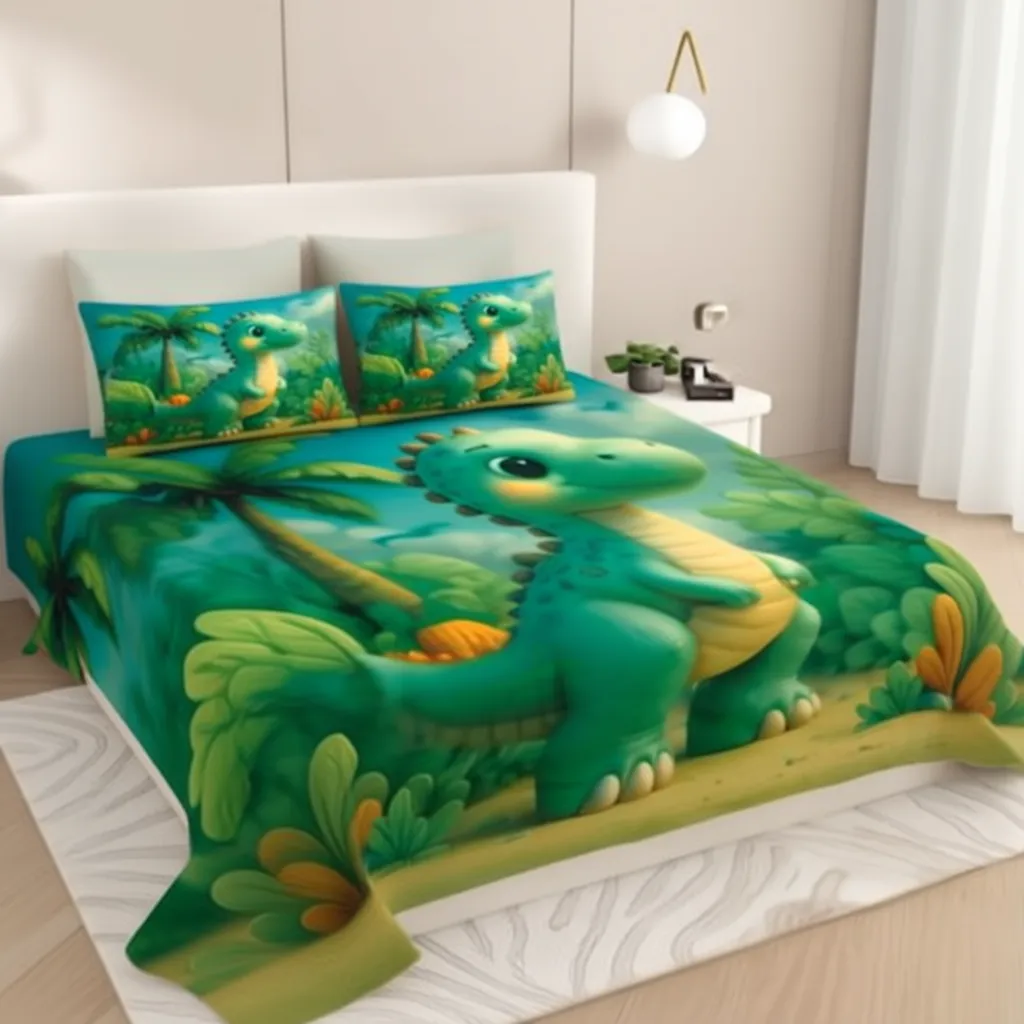 Bring the excitement of the Jurassic era to your child’s bedroom with this vibrant 7D Digital Print Bedsheet from FeelsGood Home Decor. Featuring a friendly green dinosaur amidst lush palm trees, this cheerful design sparks imagination and adventure.