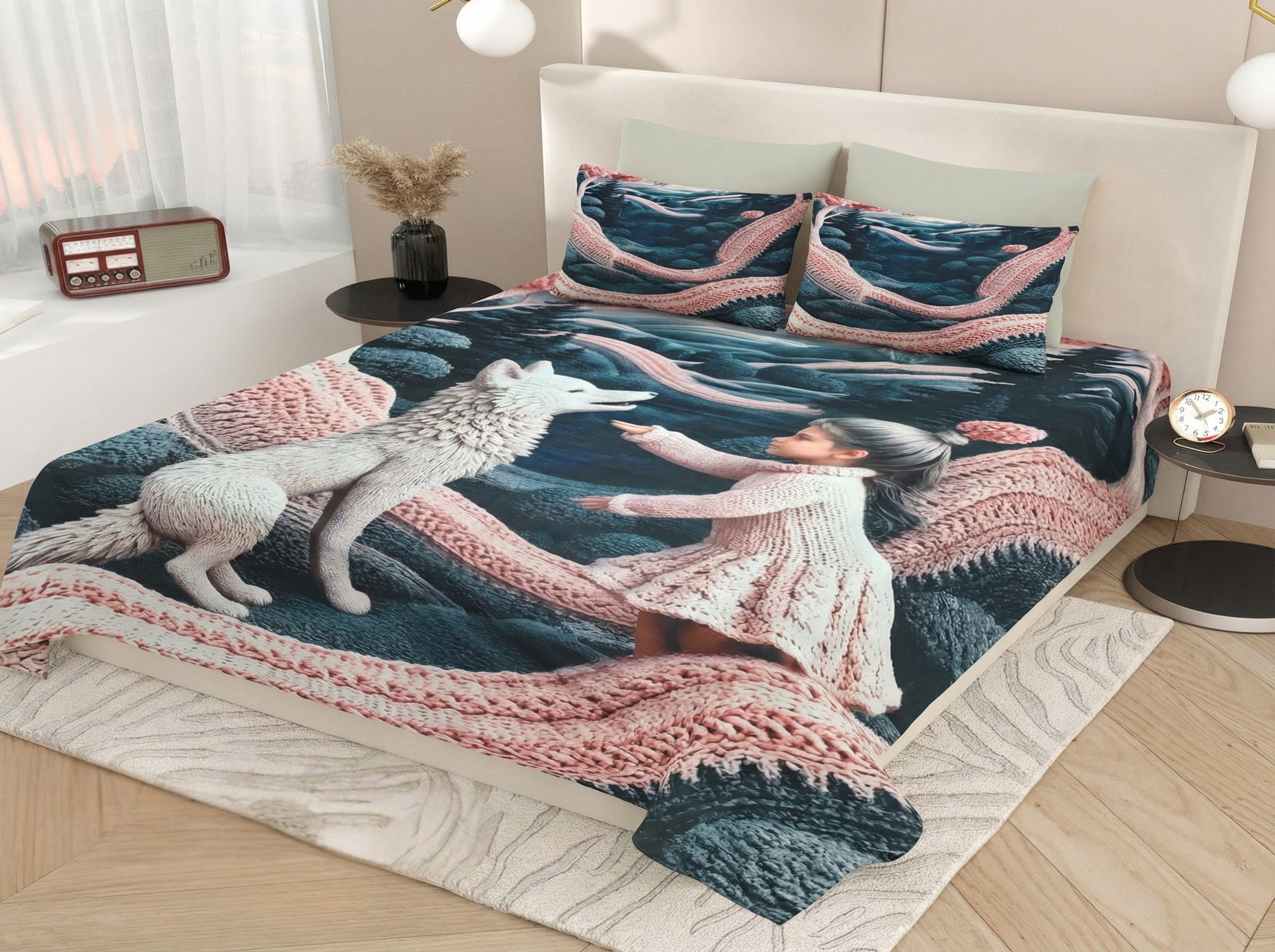 Step into a world of magic and wonder with this exquisite 7D Digital Print Bedsheet from FeelsGood Home Decor. Featuring a dreamy scene of a girl and a white wolf in a mystical pink and blue forest, this bedsheet turns your bed into a piece of art.