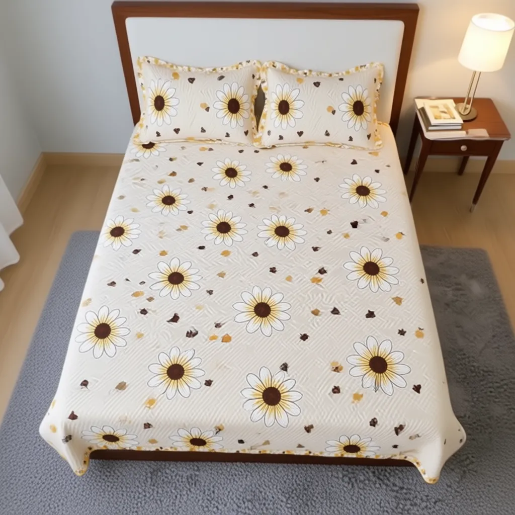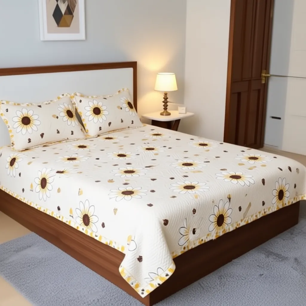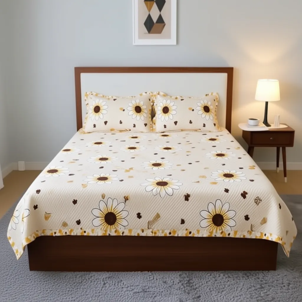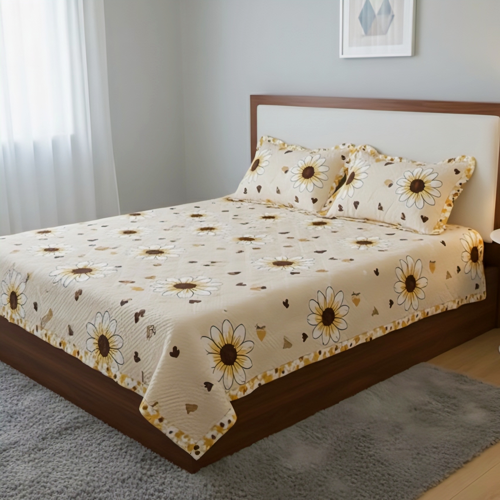Transform your bedroom into a charming, serene space with the FeelsGood Premium Daisy & Heart Floral Quilted Bed Cover. This delightful design features playful yellow and white daisies with adorable heart centers, set against a soothing pastel cream background and subtle geometric quilting—perfect for those who love cute, cozy, and inviting décor.