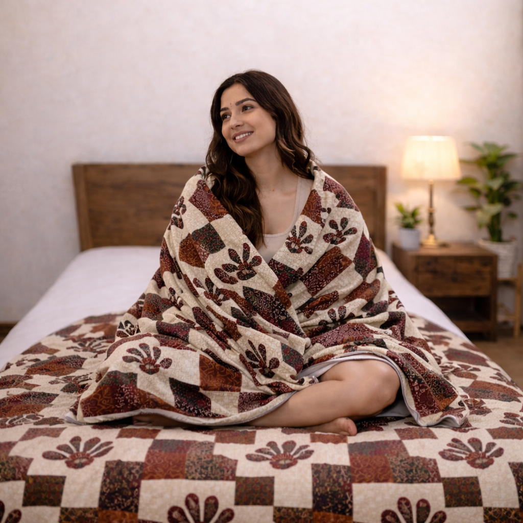 Give your bedroom a rich and elegant touch with the FeelsGood Premium Printed Dohar. Designed with a unique floral patch pattern in warm earthy tones, this dohar brings a perfect blend of tradition and modern style.