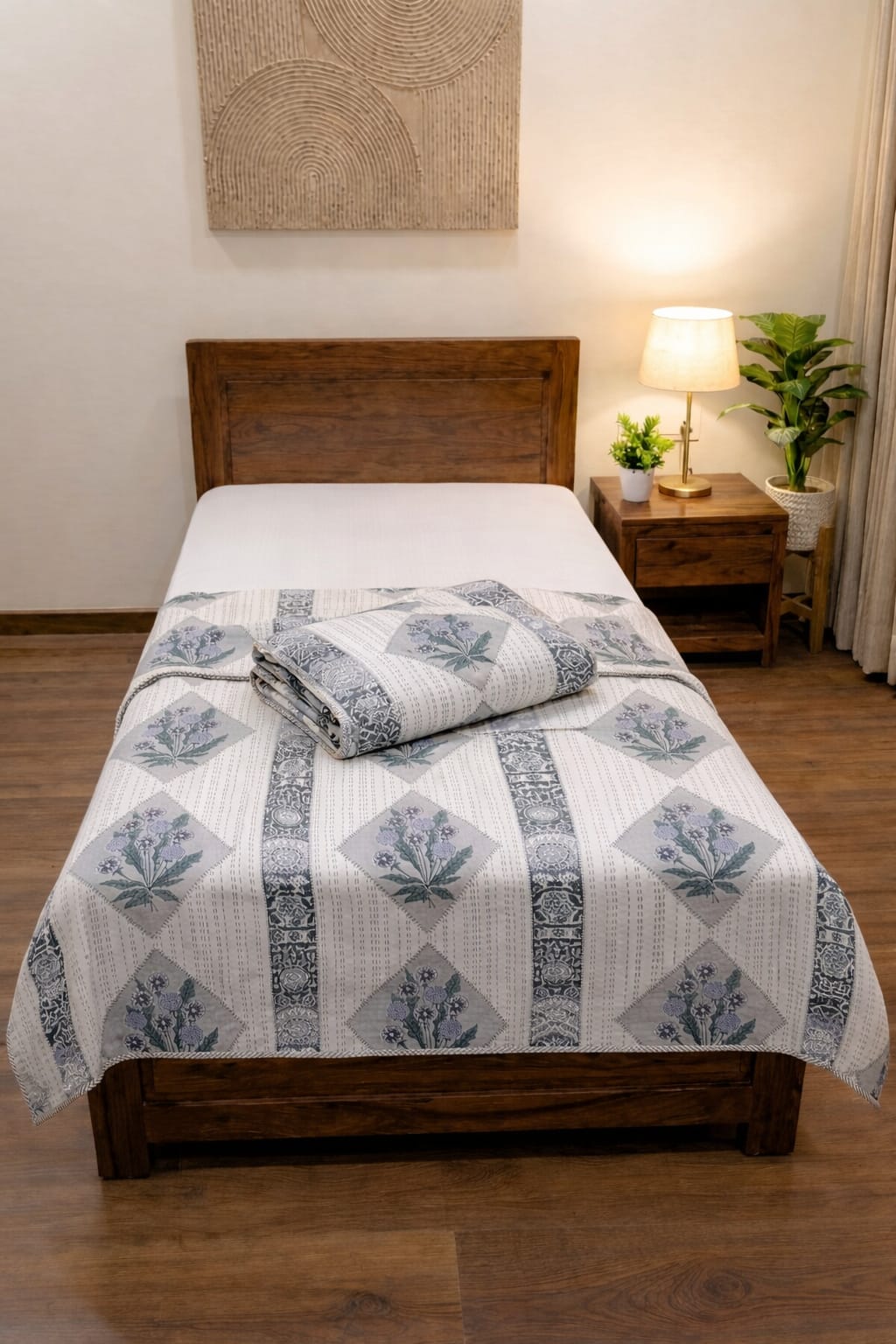 Made with soft cotton feel fabric, these dohars are lightweight, breathable, and comfortable, ensuring a cozy sleeping experience. The elegant floral printed design with subtle grey tones adds a calm and modern touch to your bedroom décor.
