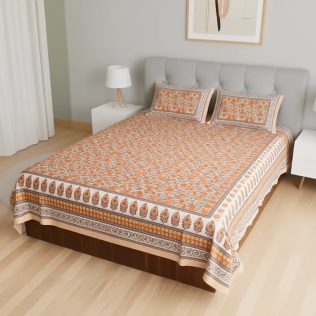 FeelsGood Queen Size Cotton Bedsheet | 100% Pure Cotton | Floral Ethnic Block Print | Mustard Yellow & Beige Colour | 90×100 Inches | 1 Bedsheet with 2 Pillow Covers