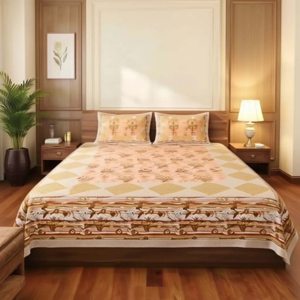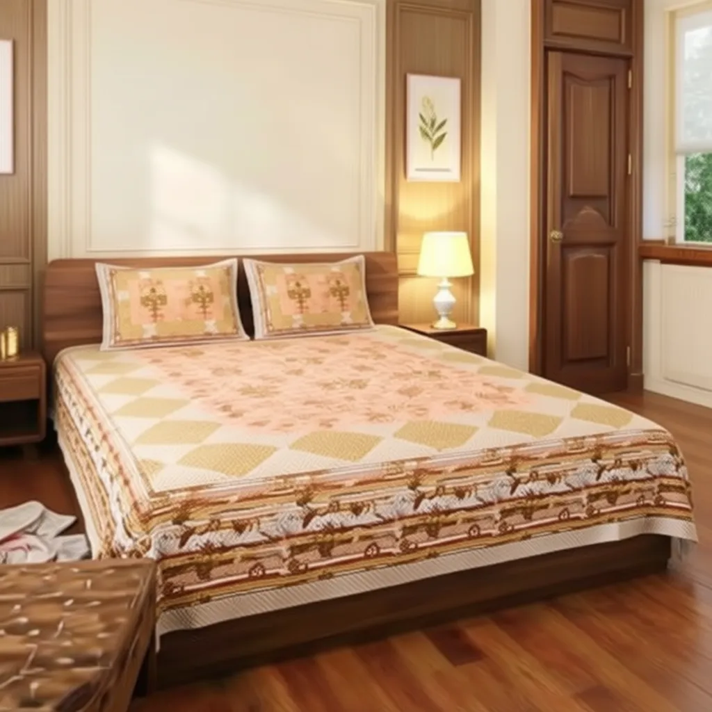 FeelsGood Queen Size Cotton Bedsheet | 100% Pure Cotton | Floral Patchwork Design | Peach & Beige Colour | 90×100 Inches | 1 Bedsheet with 2 Pillow Covers
