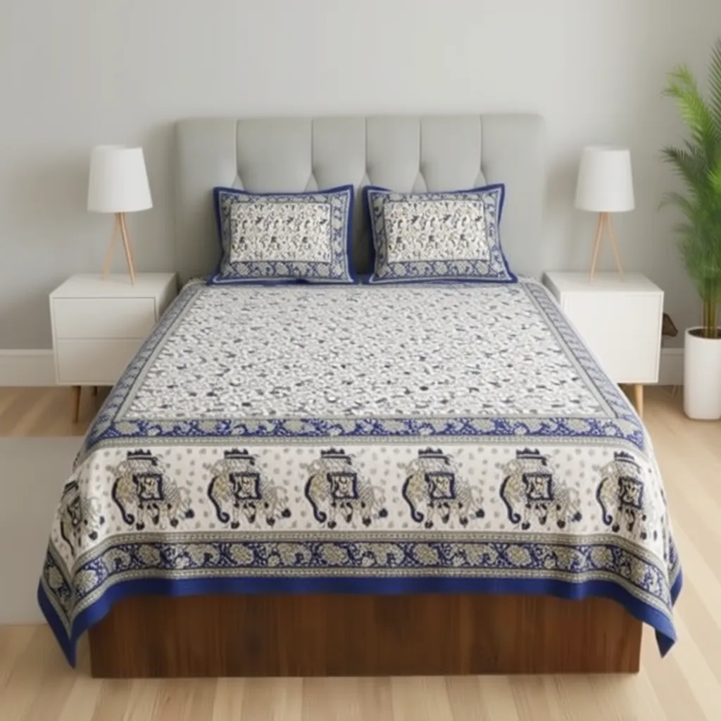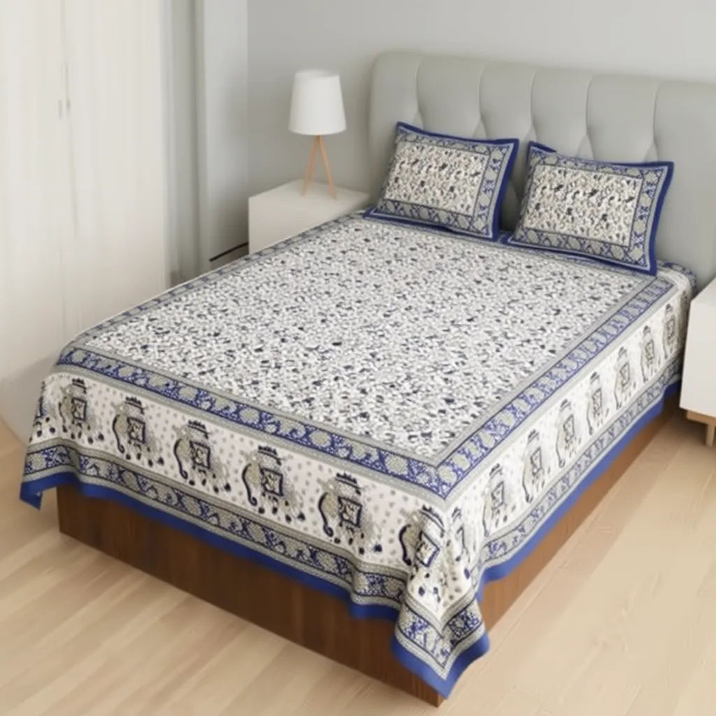 FeelsGood Queen Size Cotton Bedsheet | 100% Pure Cotton | Royal Elephant Ethnic Border Print | Navy Blue & Ivory Colour | 90×100 Inches | 1 Bedsheet with 2 Pillow Covers