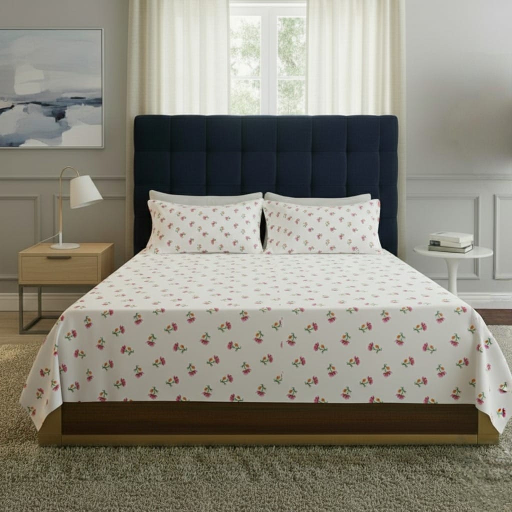 Bring charm and freshness to your bedroom with the FeelsGood Home Decor Organic Cotton Double Bed Bedsheet | White Base with Multicolor Flower Bunch Print | 230×240 cm | 2 Pillow Covers.